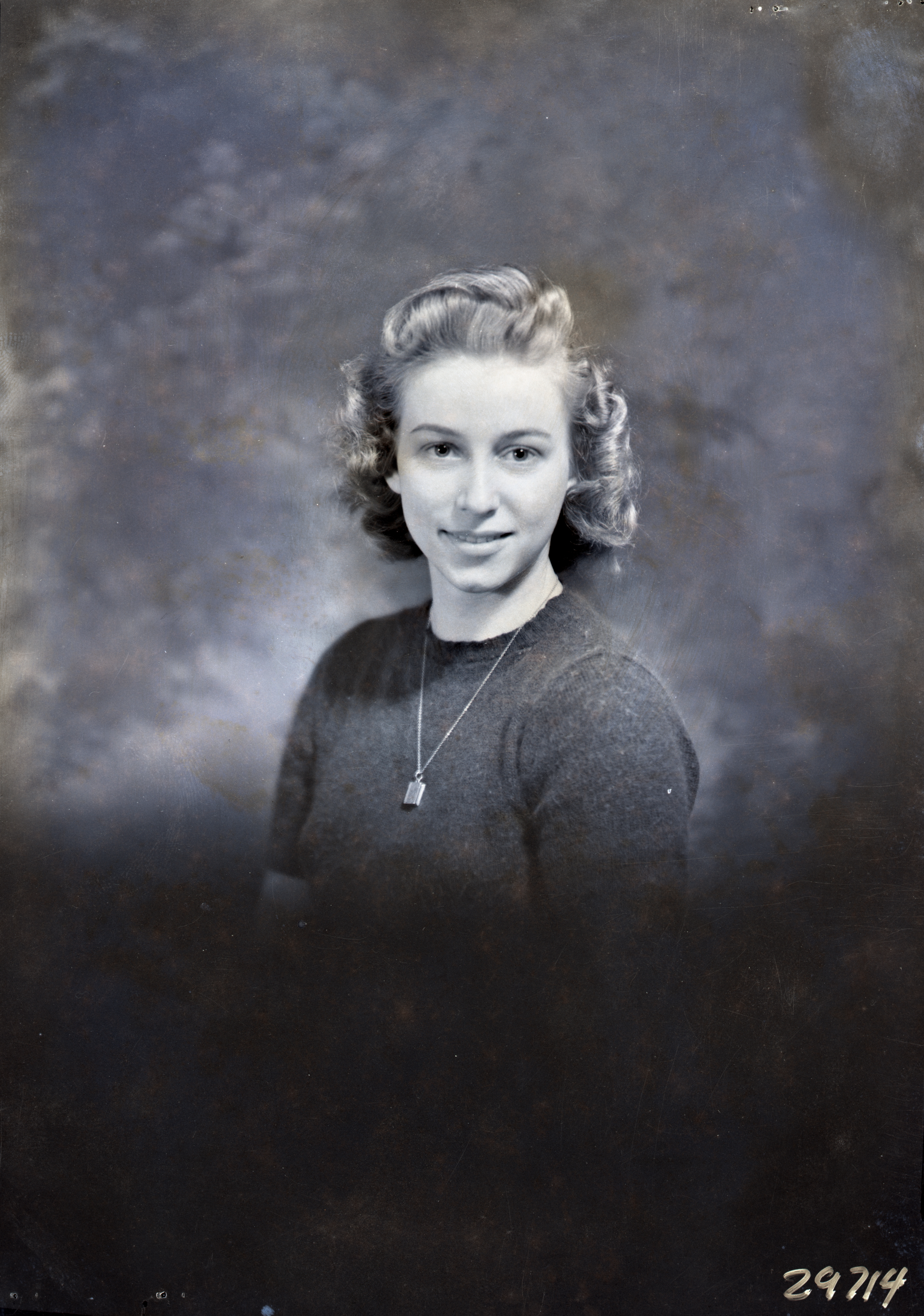 Portrait photograph of an unidentified young woman with short, curly hair and wearing a necklace.