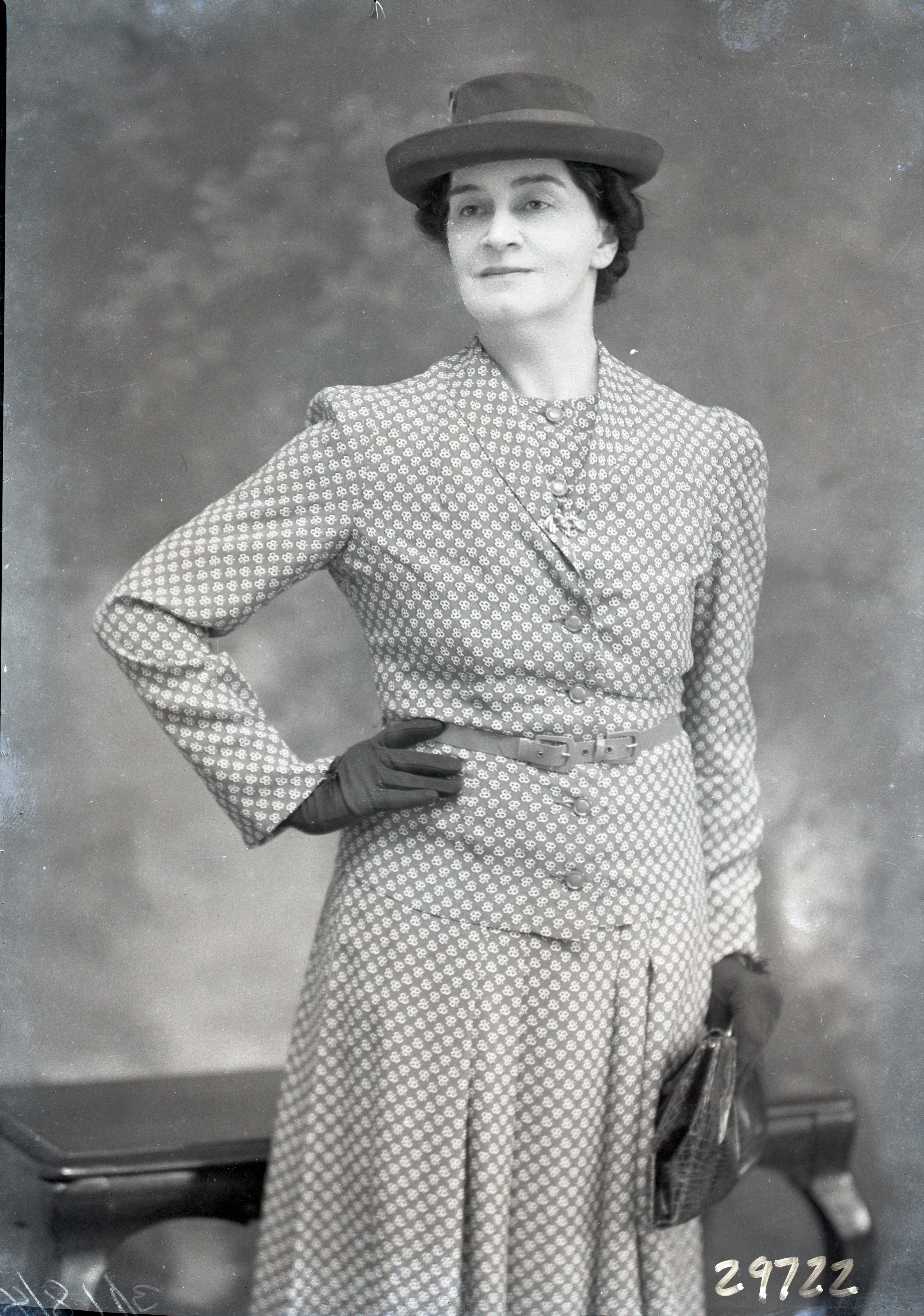 Unidentified woman in a hat and gloves is standing with one hand on her hip and the other one holding a purse.