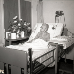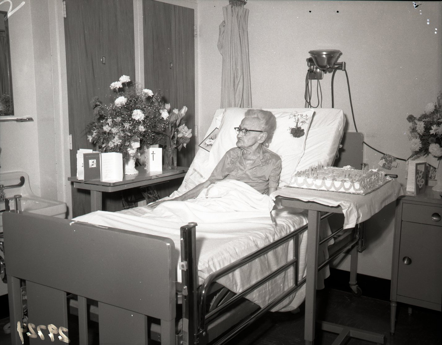 Unidentified older woman with glasses is pictured in a hospital bed with a cake with candles on a table beside her.