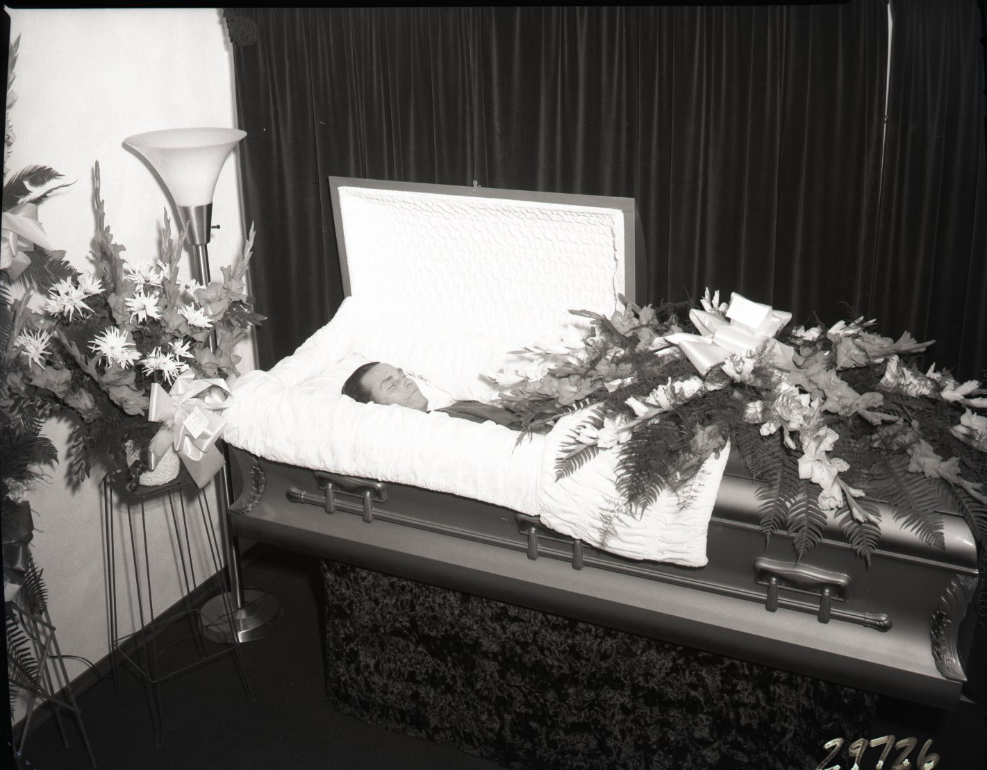 Unidentified dead man is lying in a satin-lined casket surrounded with flowers draping the lower half of it.