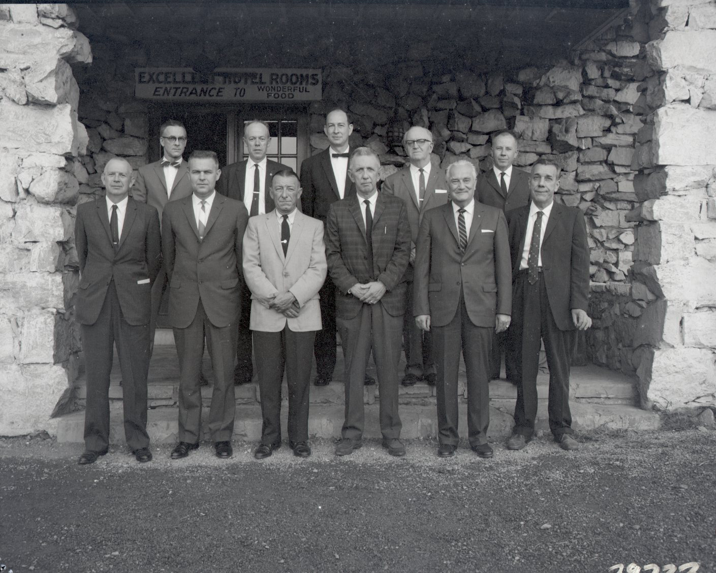 Group of unidentified men in suits and ties are standing together in front of a stone building.