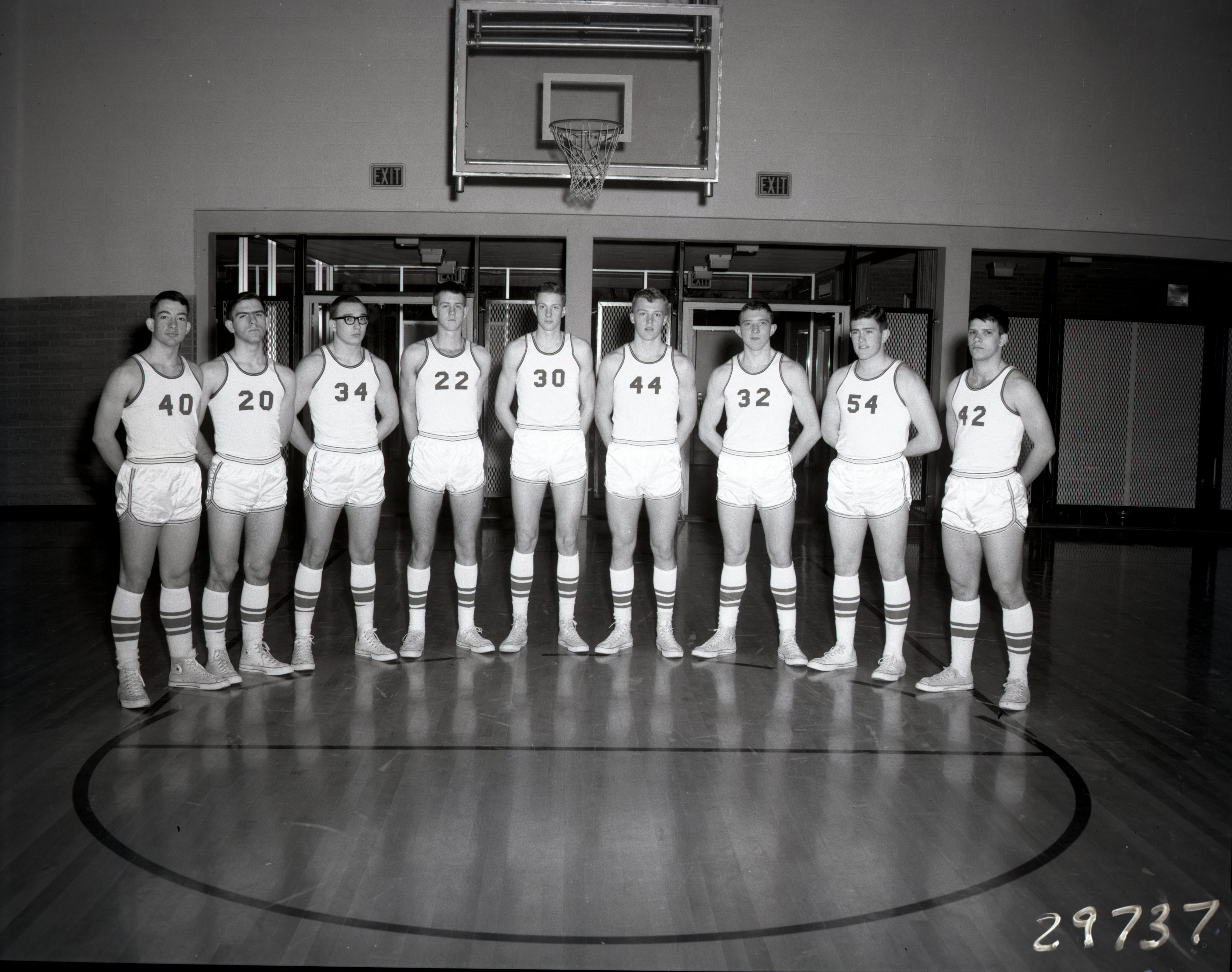 Group of unidentified cadets from Massanutten Military Academy (MMA) wearing their school's basketball uniforms and posed under the basketball goal in the gymnasium.
