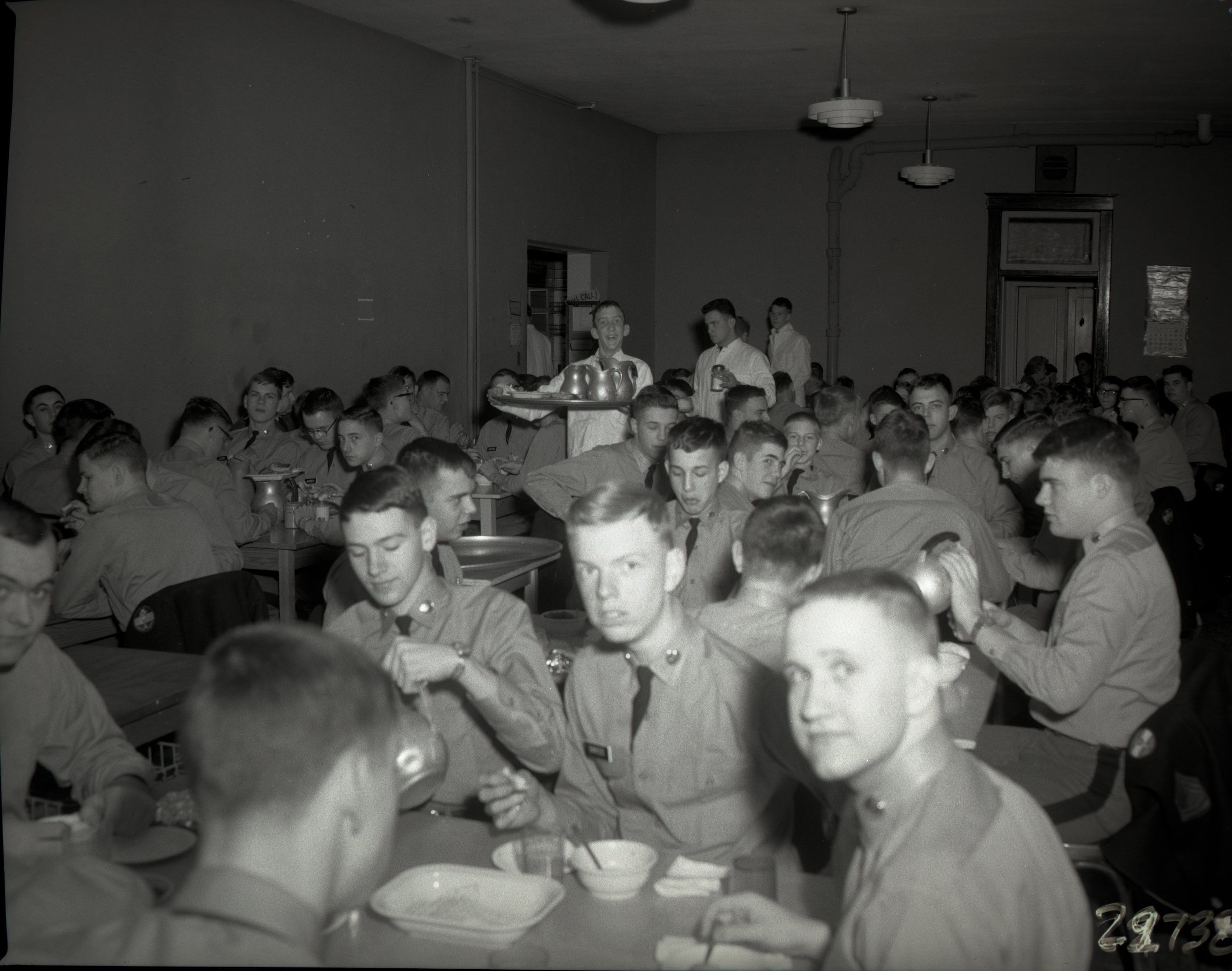 Unidentified waiters are seen carrying trays of food and attending to the cadets.