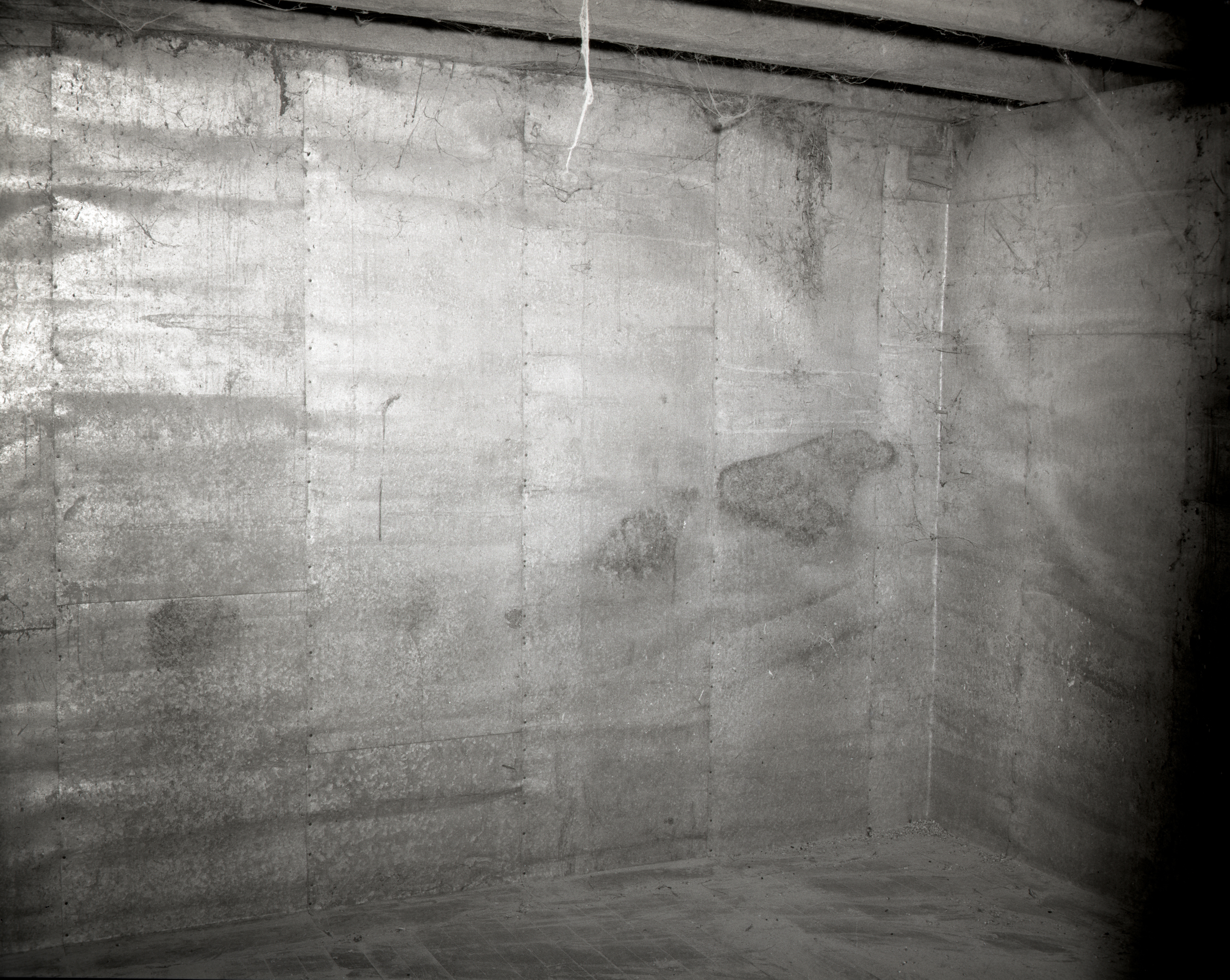 There is dirt on the floor and wooden floor joists for a ceiling indicating, perhaps, this was a basement room.
