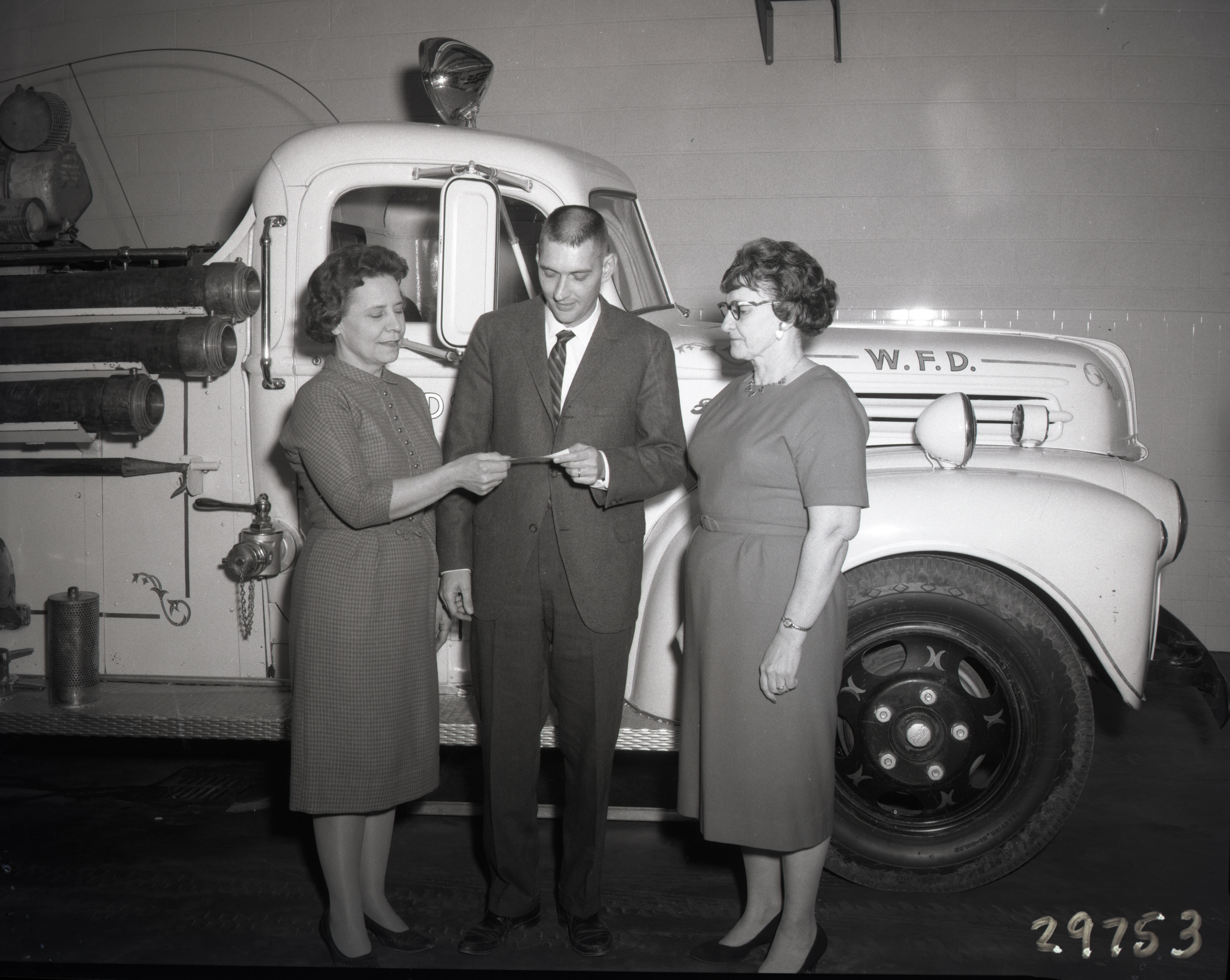 Two unidentified women are presenting a check to Joe Hottle, center. All three are standing in front of a vintage fire truck.