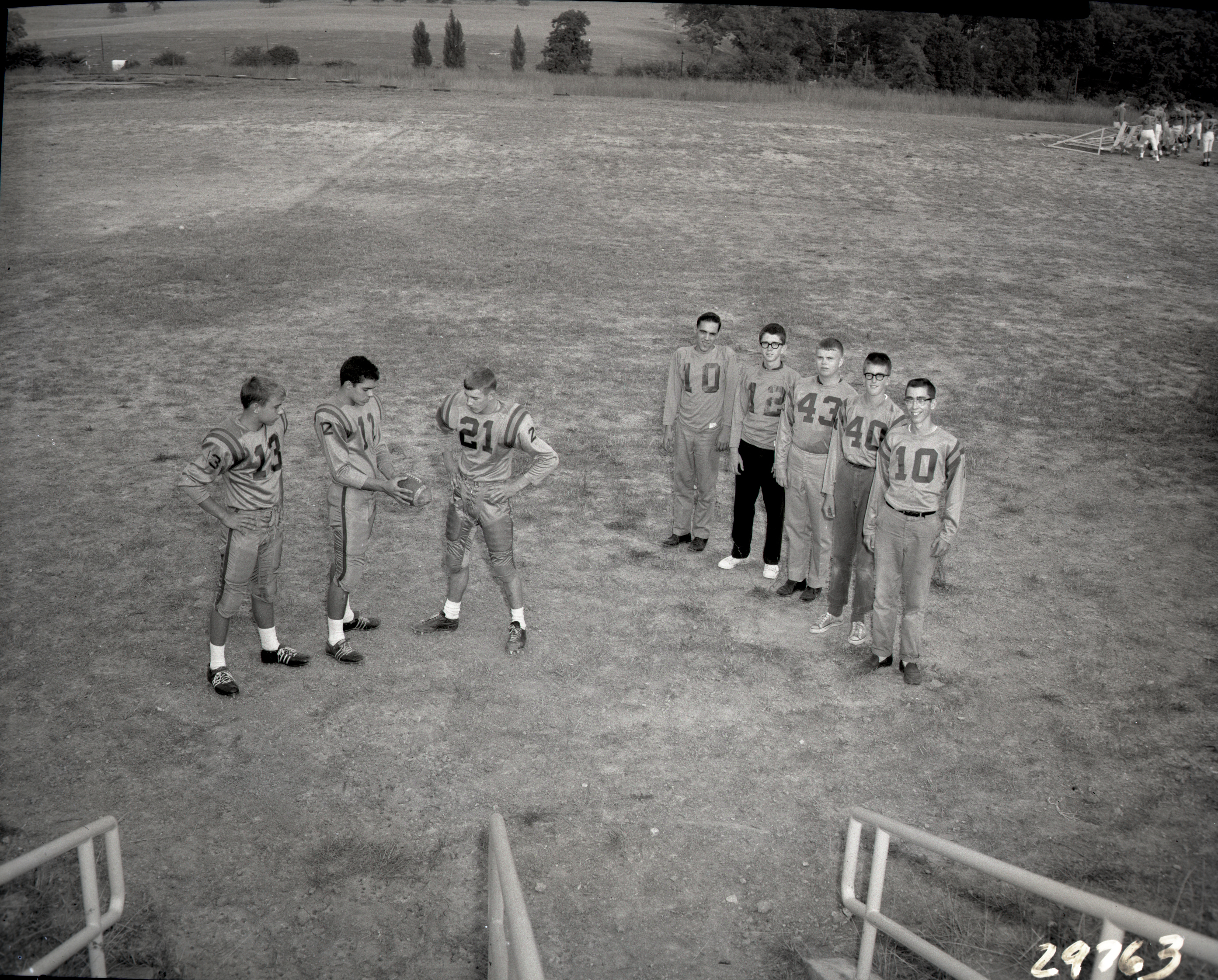 Photograph of eight unidentified Central High School football players from the 1964 season.