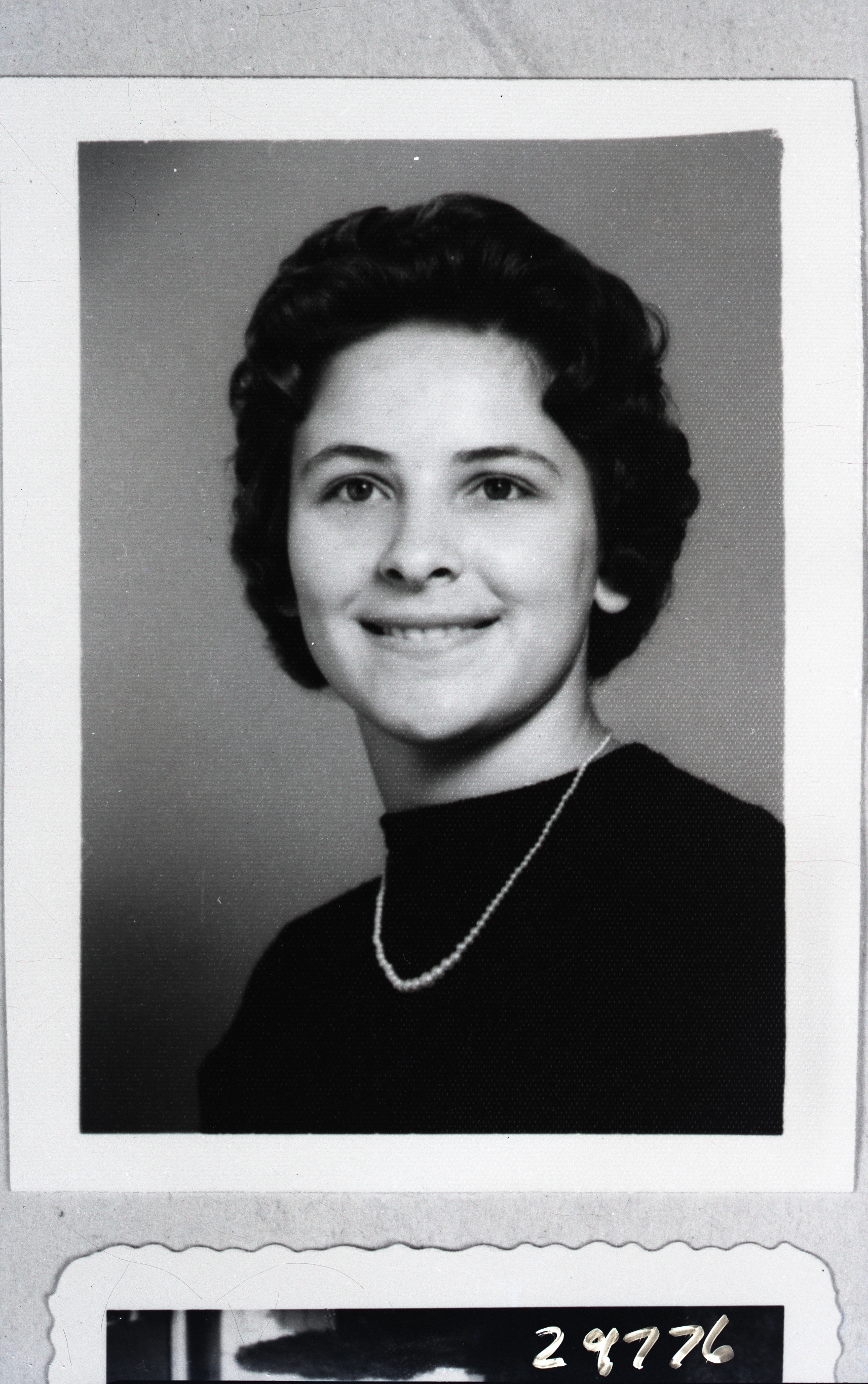 Photo of a portrait photograph of an unidentified young woman with short hair and wearing faux pearls.
