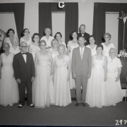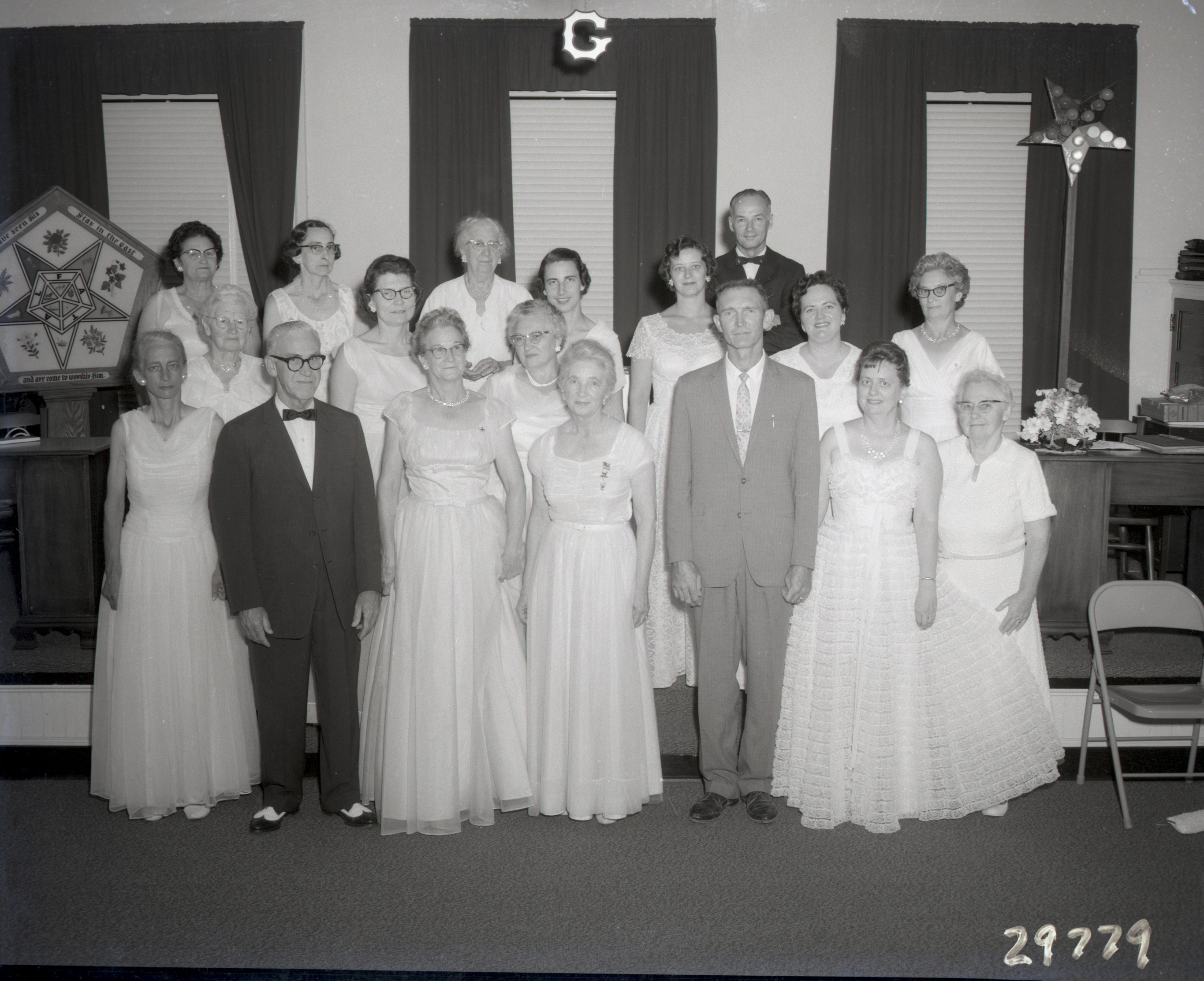 Members of the civic organization, Order of the Eastern Star, stand together in two rows. All are in formal wear.