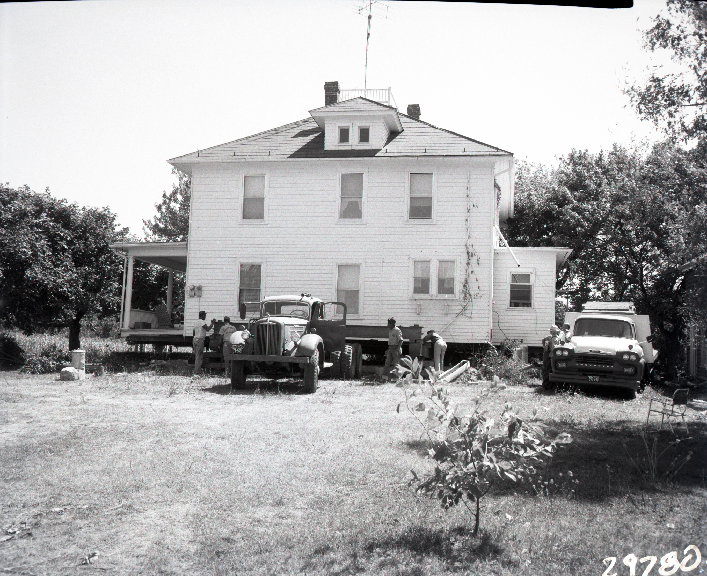 Unidentified men are adjusting the beam that will support the house as it is lifted and moved to another location.