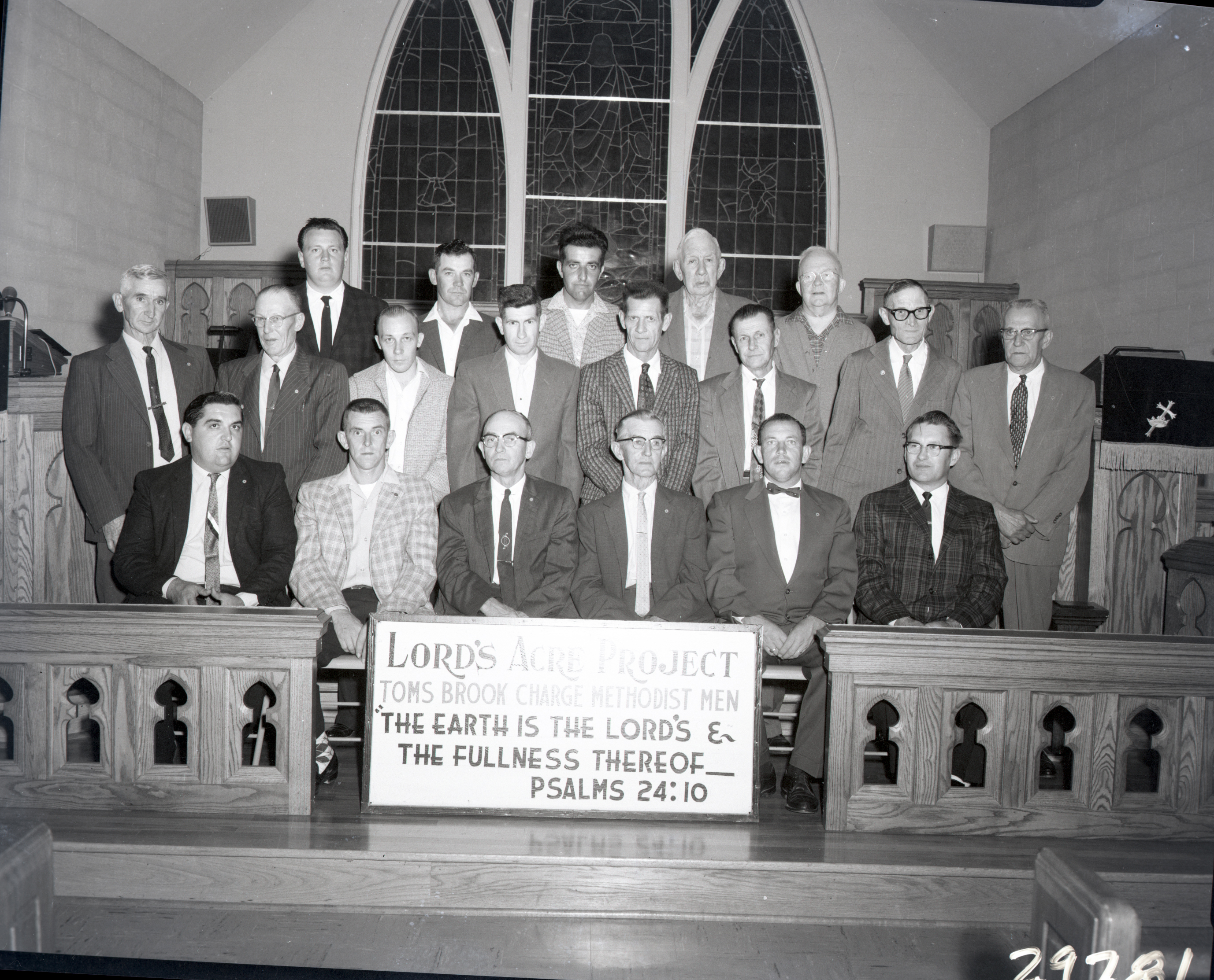 Unidentified members of Toms Brook Methodist Church on Main Street (Route 11), are posed together with a sign that says "Lord's Acre Project".