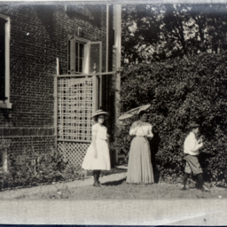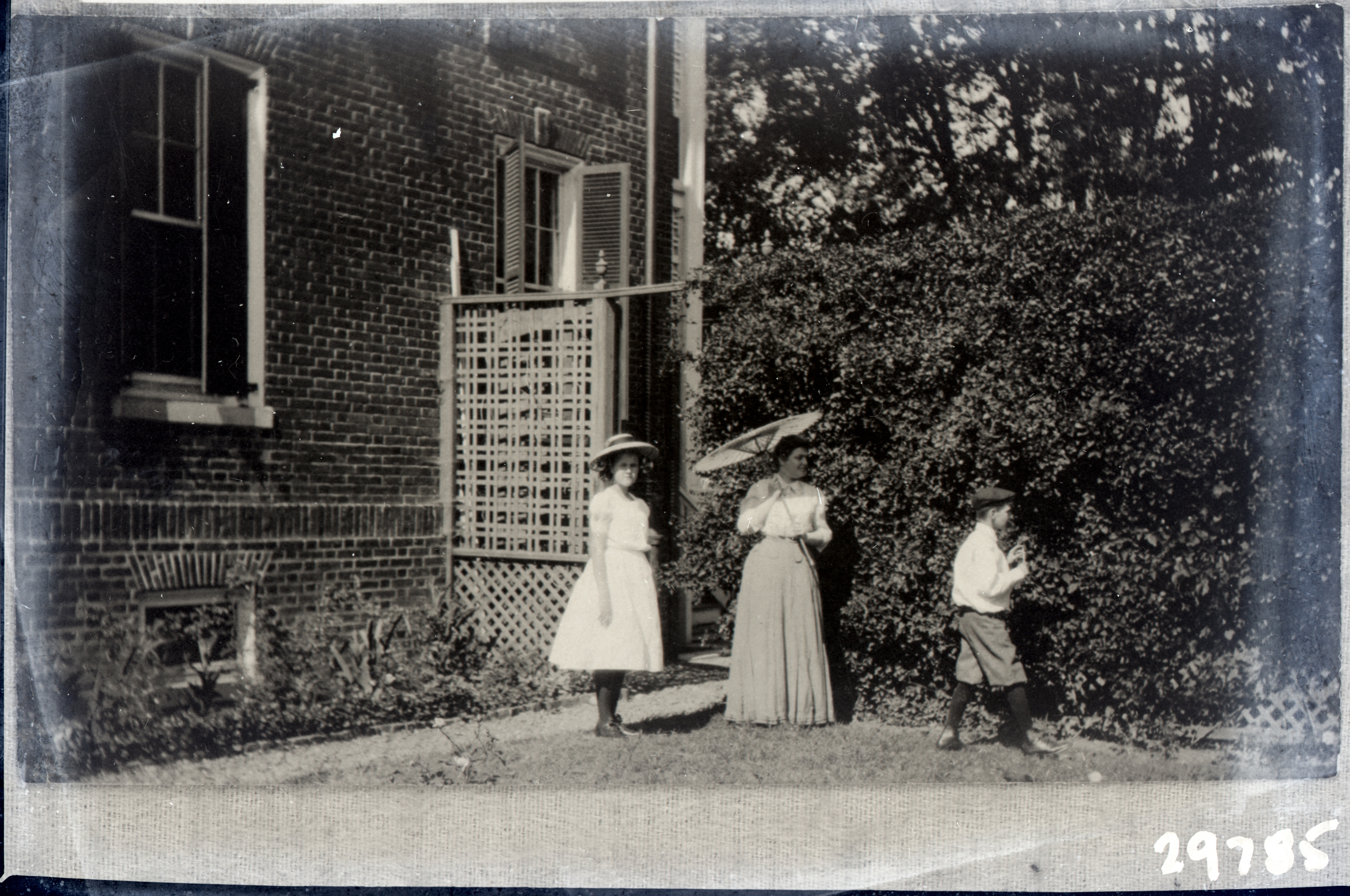 Photo of an older photograph of an unidentified woman holding a parasol and wearing a long skirt with two unidentified children, a girl and a boy in short pants, standing beside her.