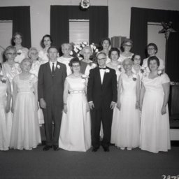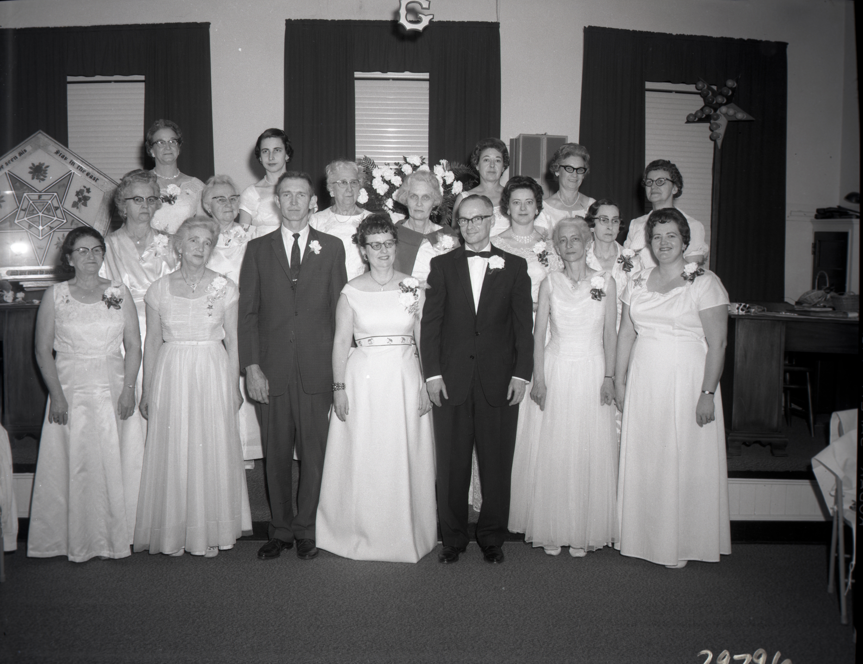 Members of the civic organization, Order of the Eastern Star, stand together. All are in formal wear.