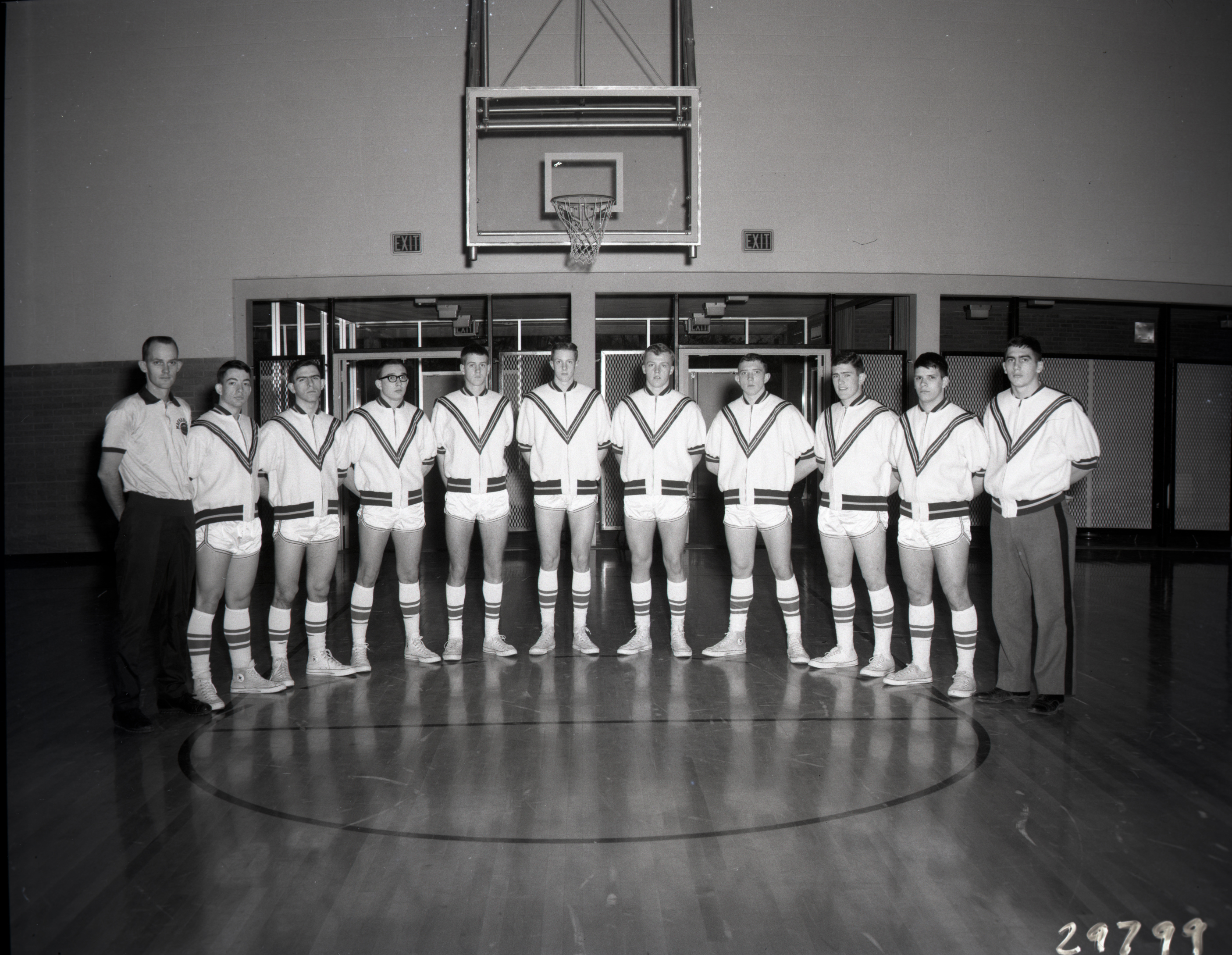 Unidentified cadet members of Massanutten Military Academy's (MMA) basketball team photographed with their coach (left) in the school's gymnasium.