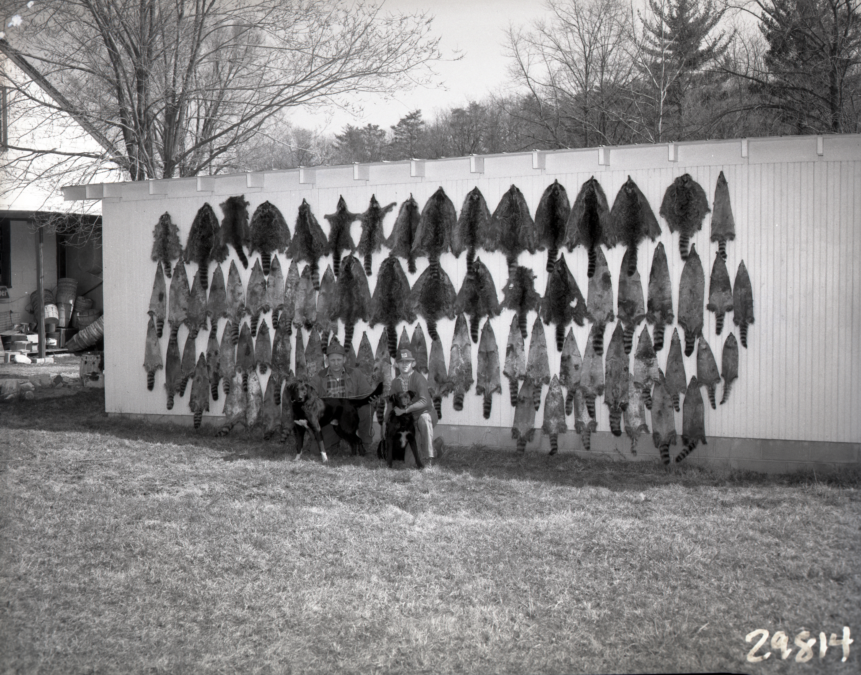 Two unidentified men and a boy, all in hunting clothes and caps, are posed with their three hunting dogs in front of a wall of raccoon pelts displayed in rows.