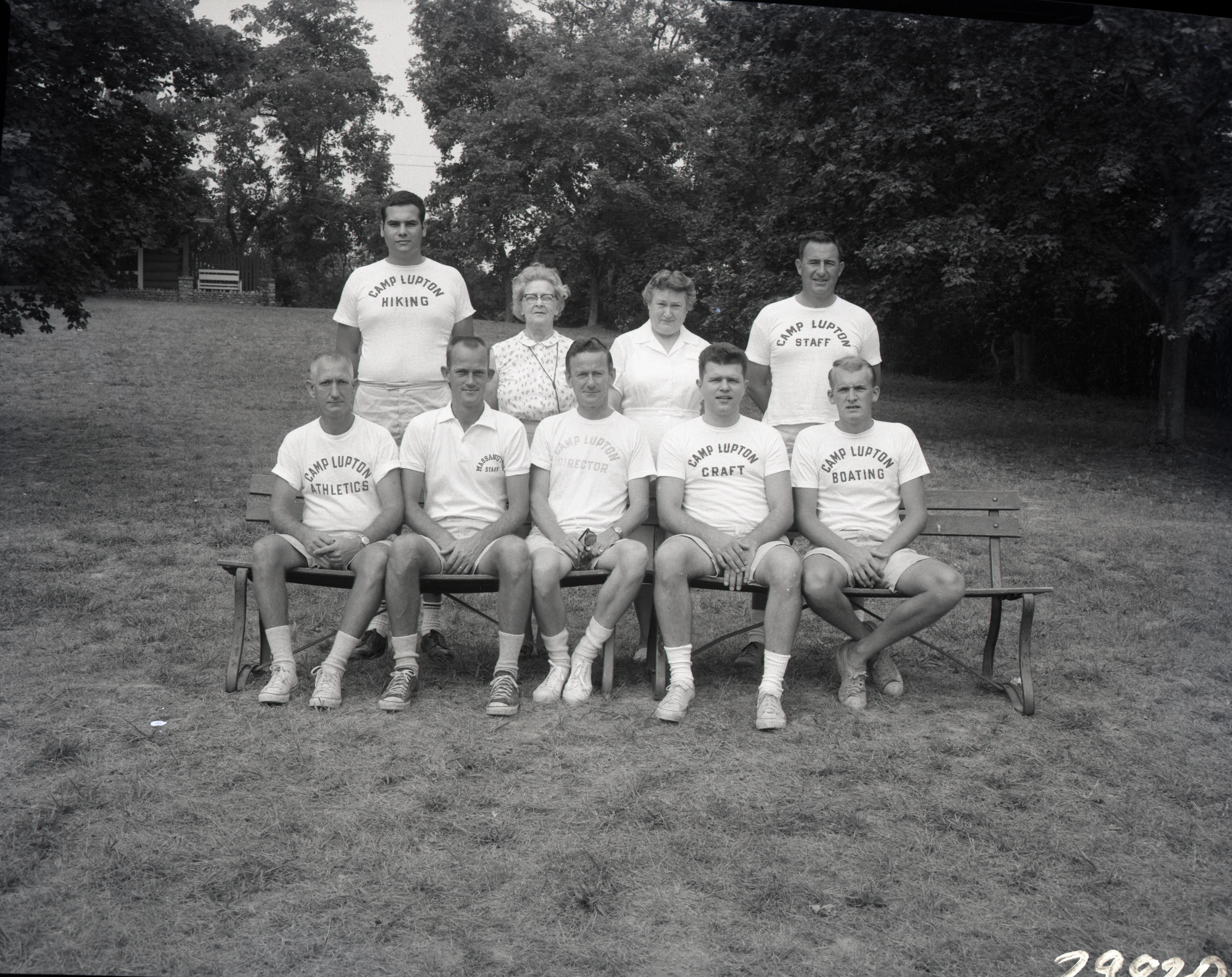 Photograph of unidentified members of the Camp Lupton staff posed in two rows outdoors.