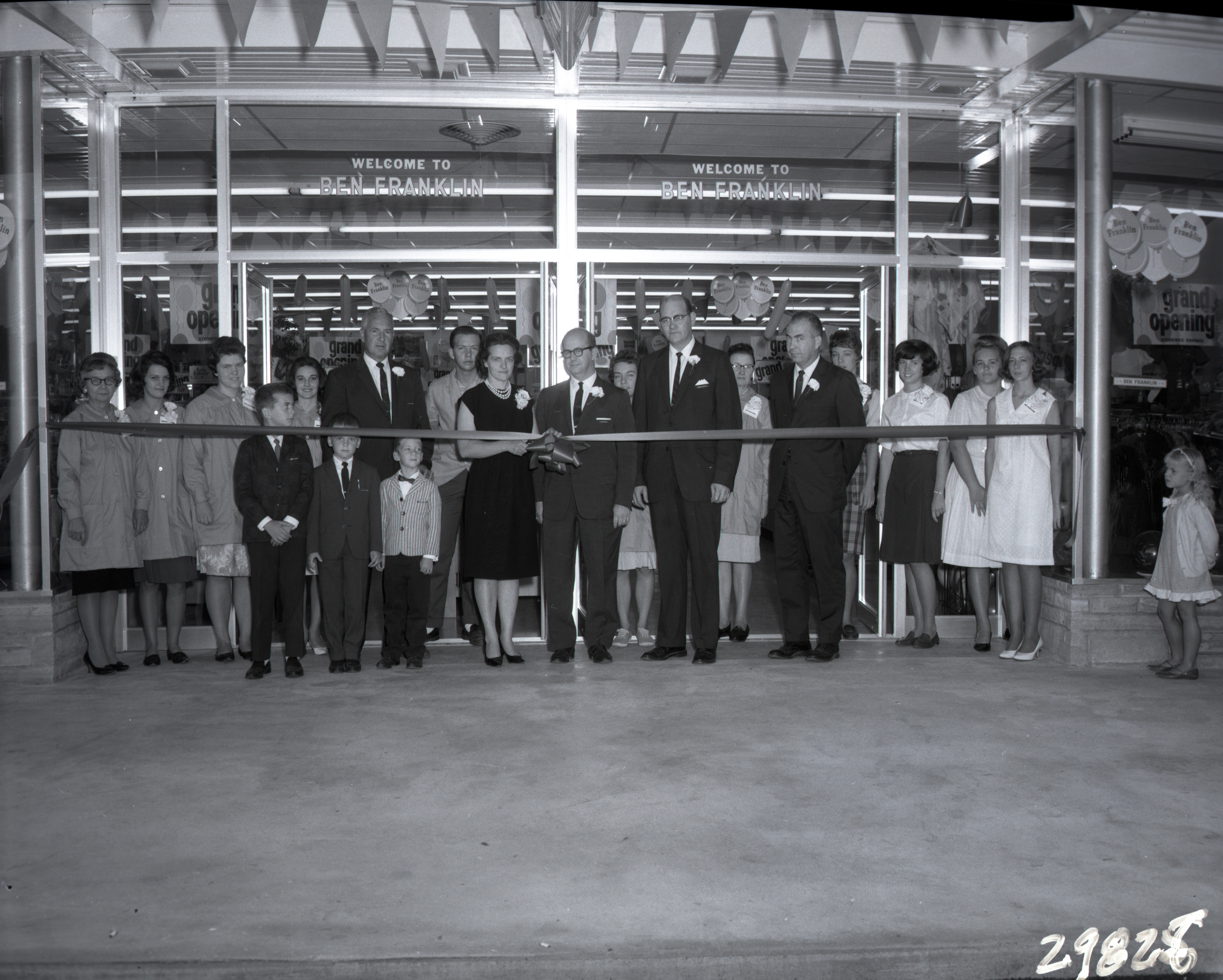 Photograph showing ribbon cutting and dedication of the Ben Franklin Store in Woodstock.