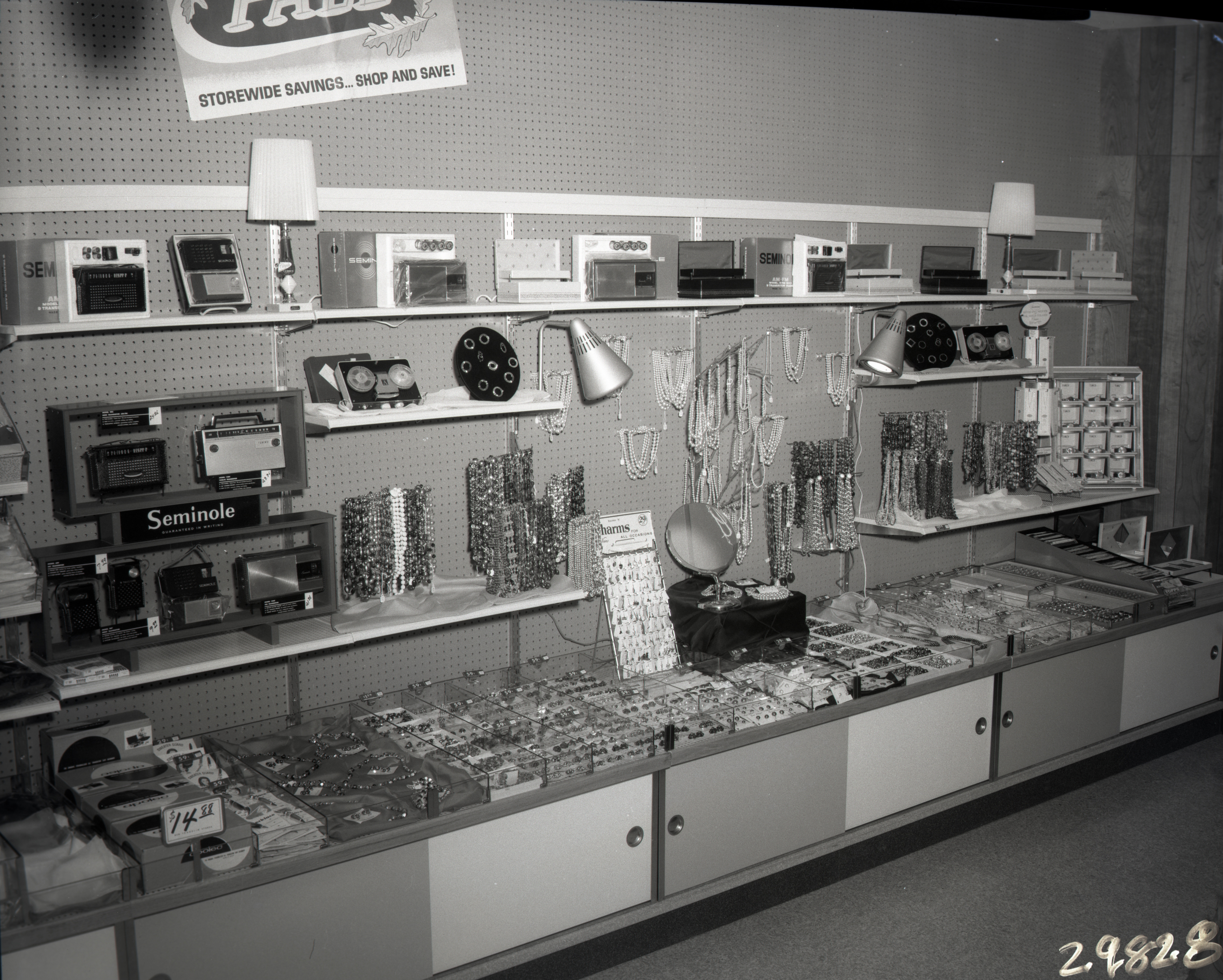 Photograph of a store display. Costume jewelry and Seminole radios are featured on the shelves.
