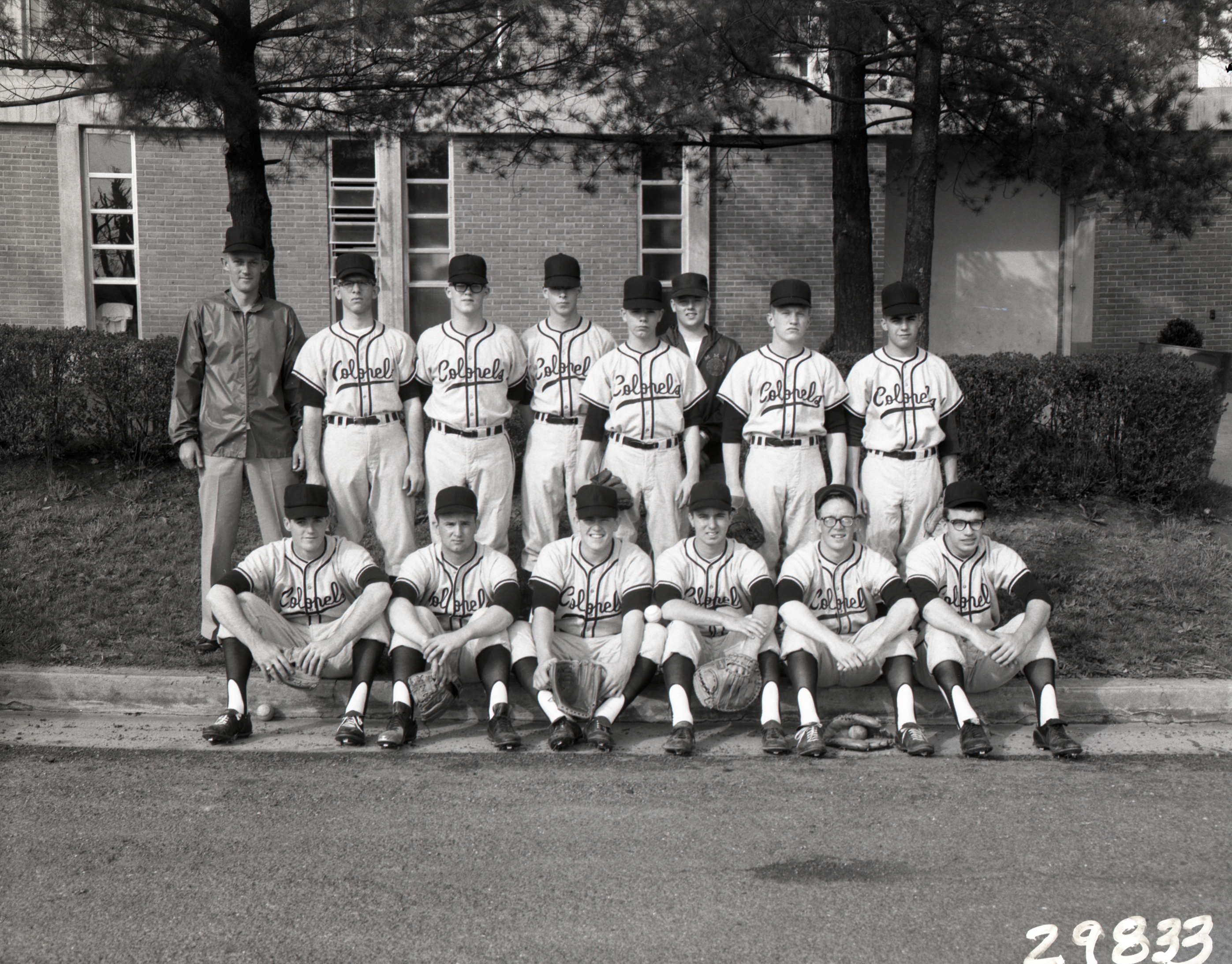 Unidentified cadets from the Massanutten Military Academy (MMA) Colonels baseball team assembled together outside.