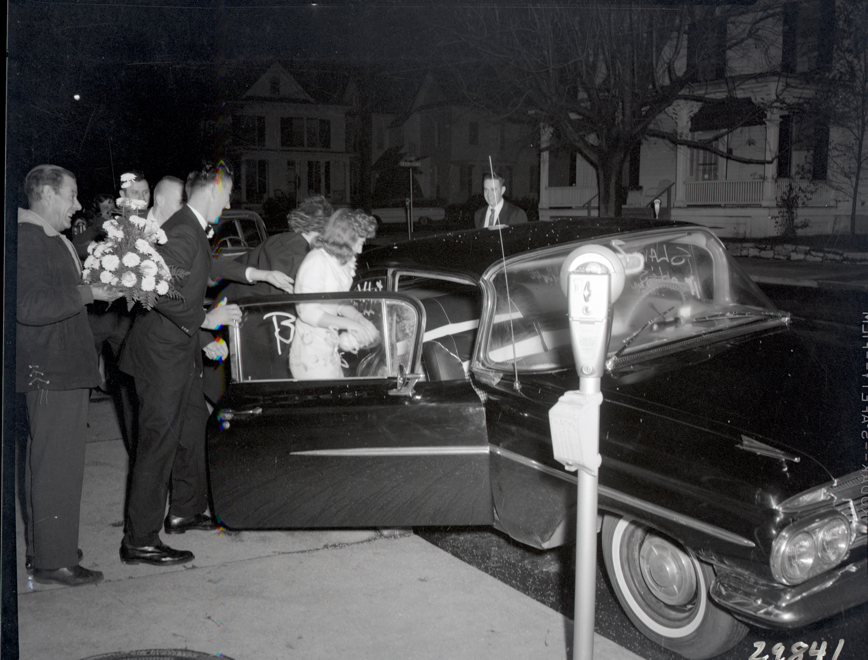 Photograph taken at night of unidentified well wishers ushering an unidentified new bride and groom into a car.
