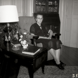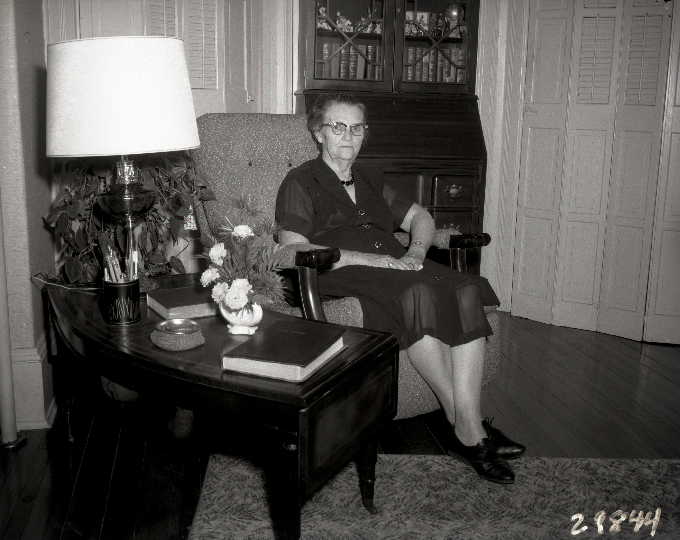 Unidentified older woman with her hair pulled back and glasses is seated in a chair beside a small table with a bible and a vase of flowers on it.