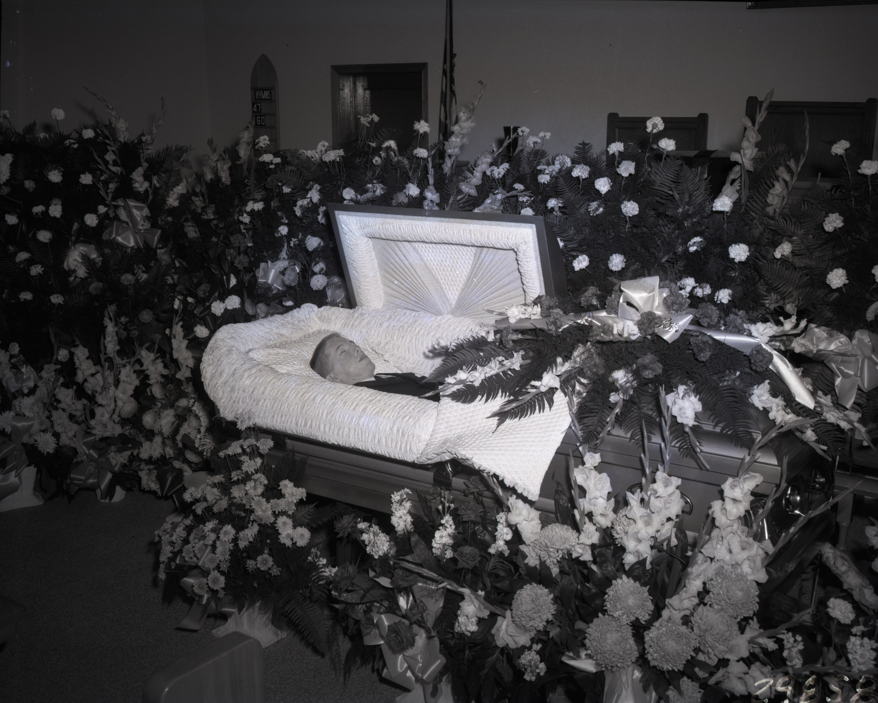 Unidentified young dead man is lying in a satin-lined casket surrounded by flowers.
