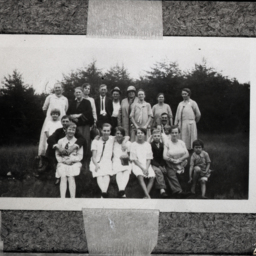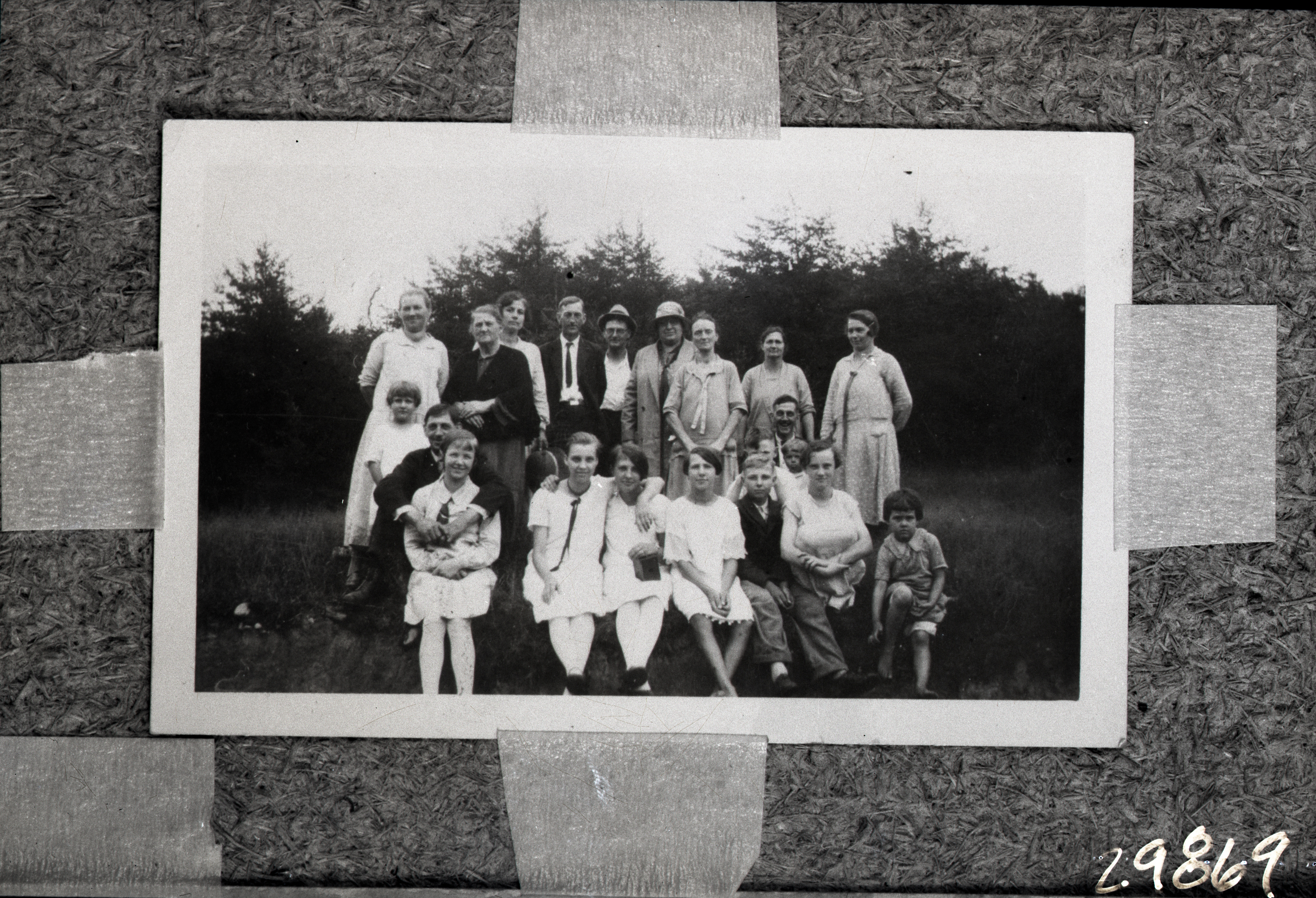 Photo of a photograph of a large group of unidentified men, women, and children, posed together outdoors.