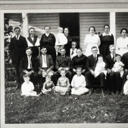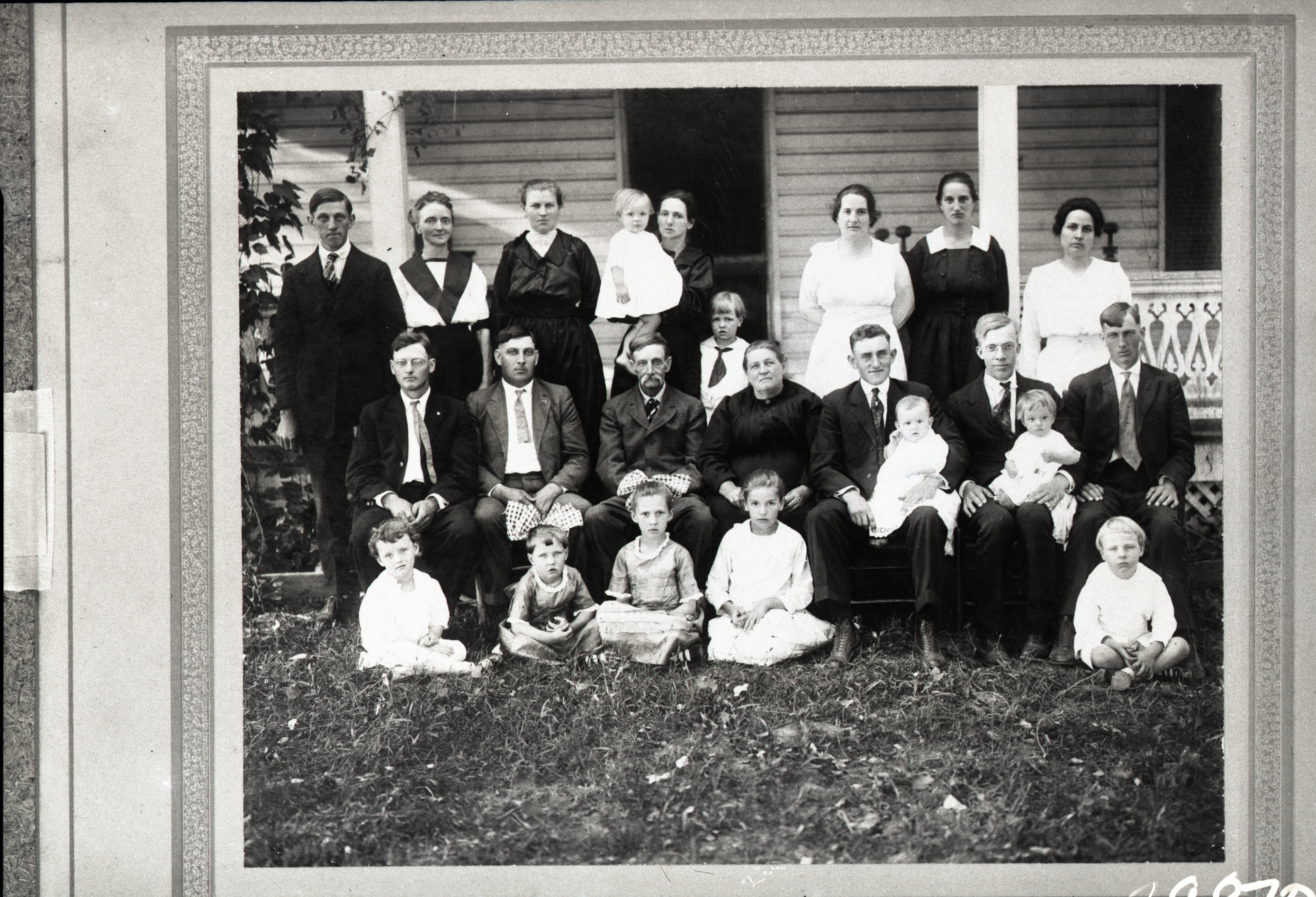 Photo of a framed photograph of an unidentified group of men, women, and children posed outdoors on the porch of a house.