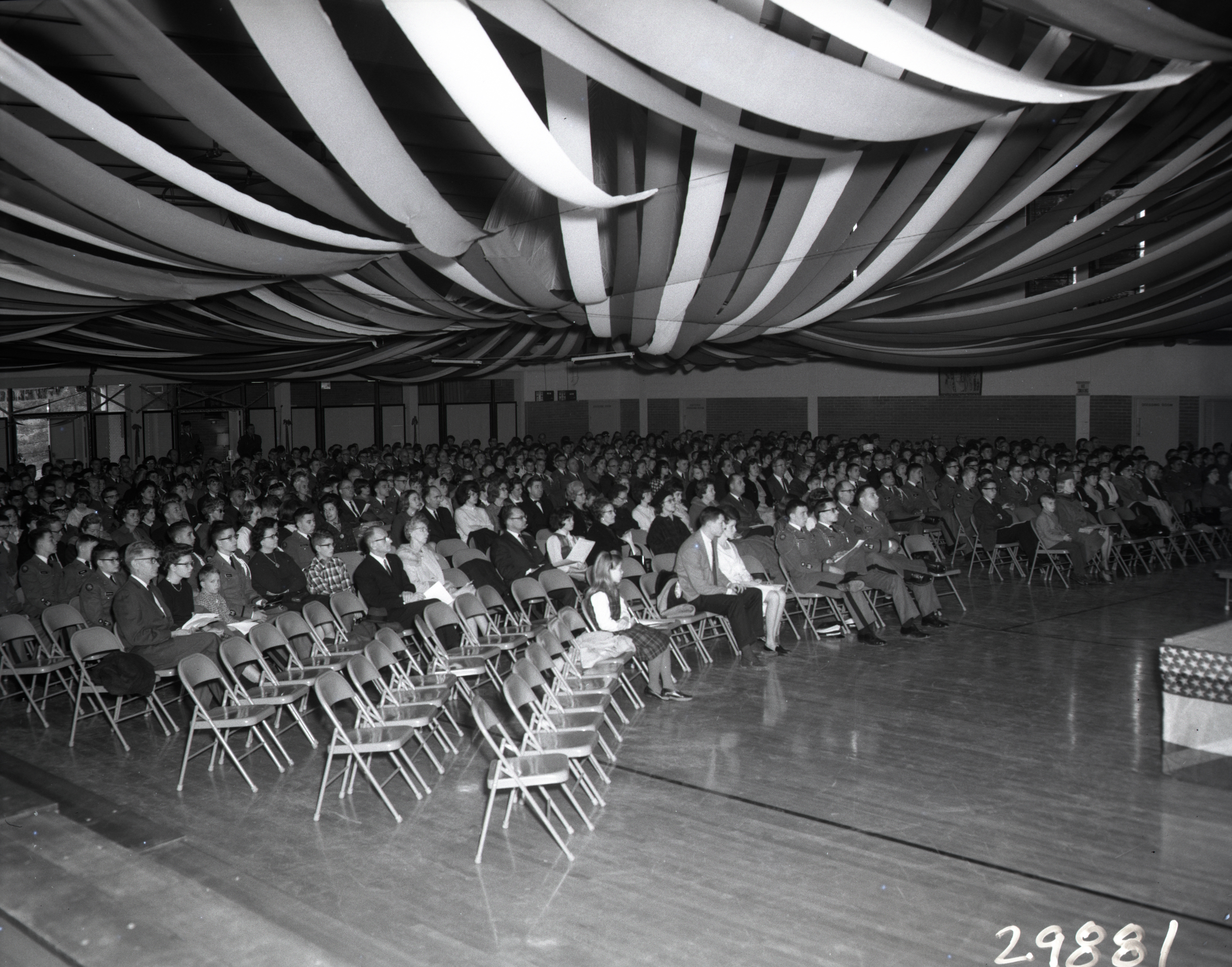 Photograph of the audience watching the U.S. Army Band from Washington D.C. performing in the gymnasium of Massanutten Military Academy (MMA).