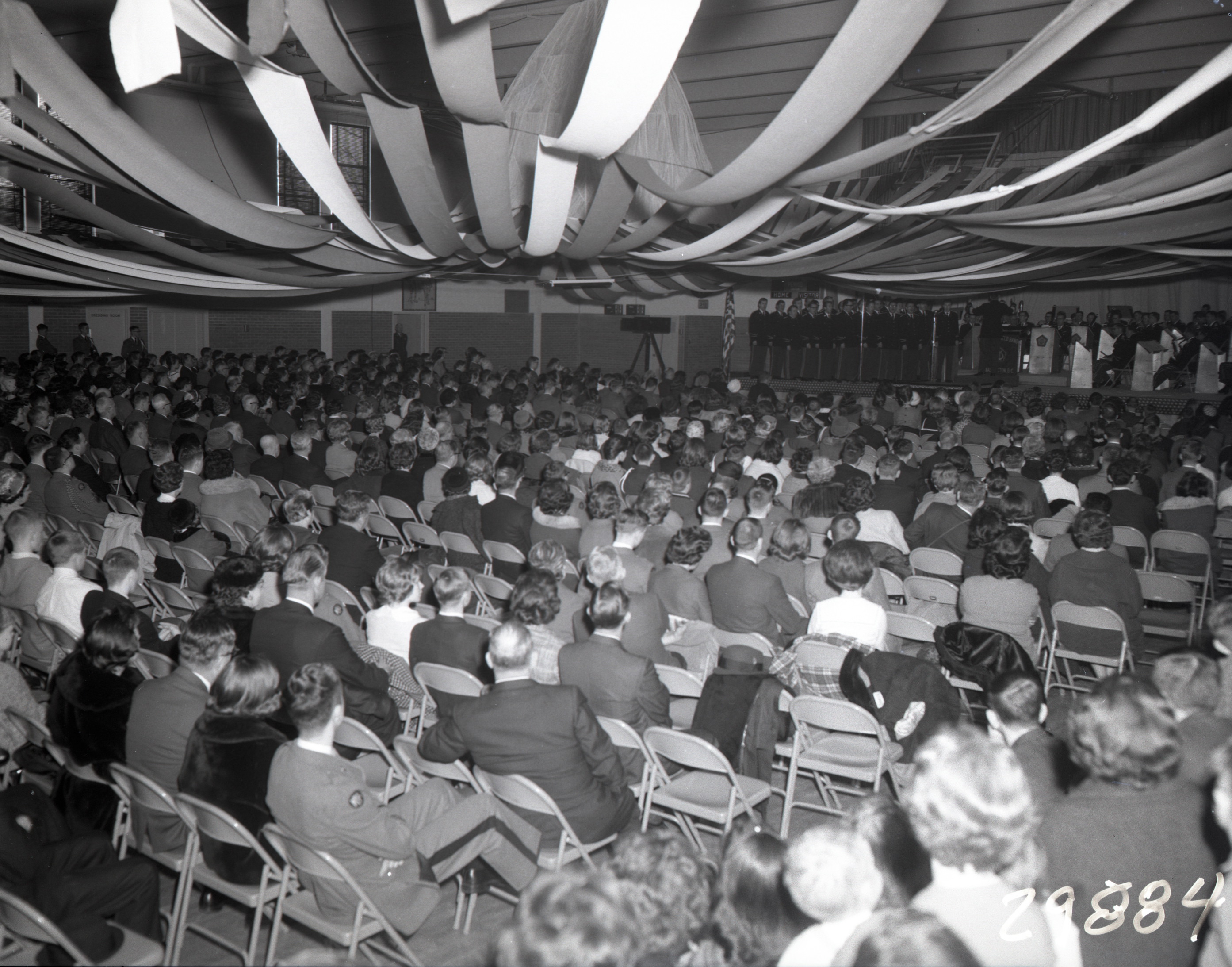 Photograph of the audience watching the U.S. Army Band from Washington D.C. performing in the gymnasium of Massanutten Military Academy (MMA).