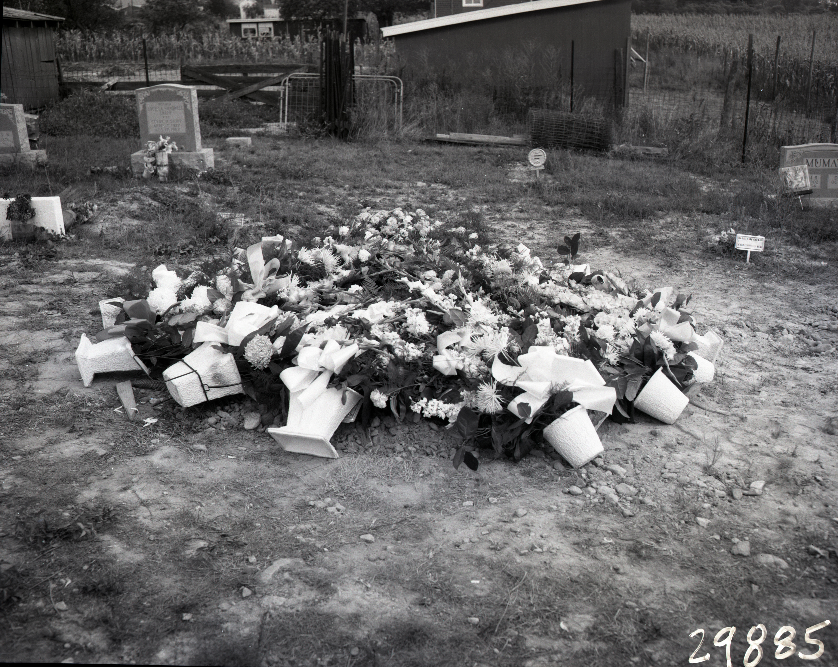 Photograph of several flower arrangements lying over an unidentified fresh grave.