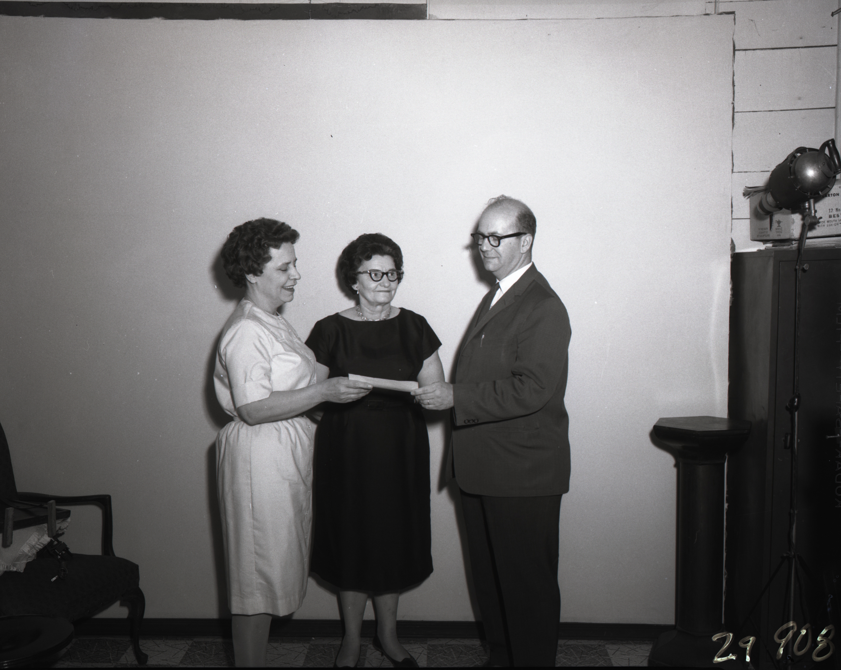 Two unidentified women are presenting some kind of award or certificate to Donald H. Garman.
