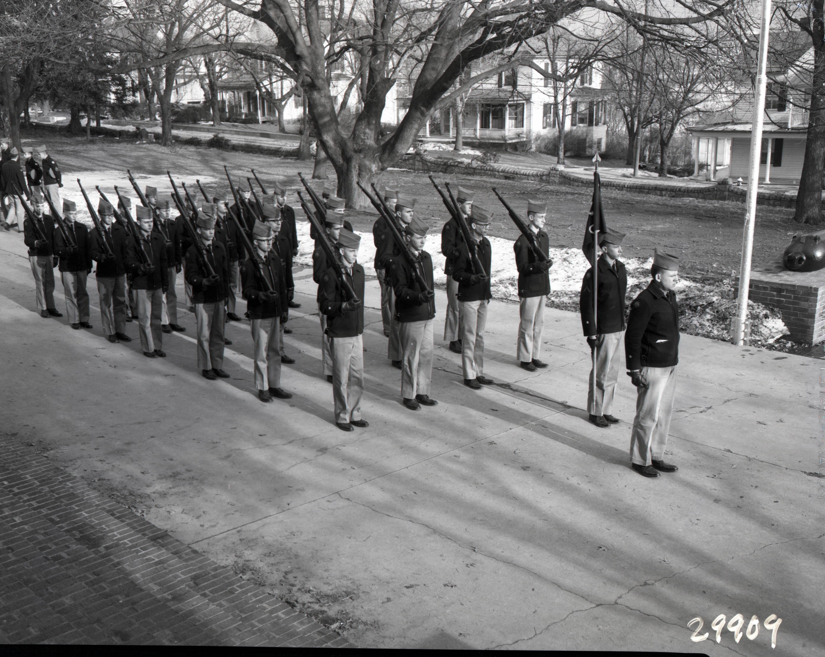 Group of unidentified cadets from Massanutten Military Academy (MMA) are standing in parade formation in front of Lantz Hall, with rifles on their shoulders.
