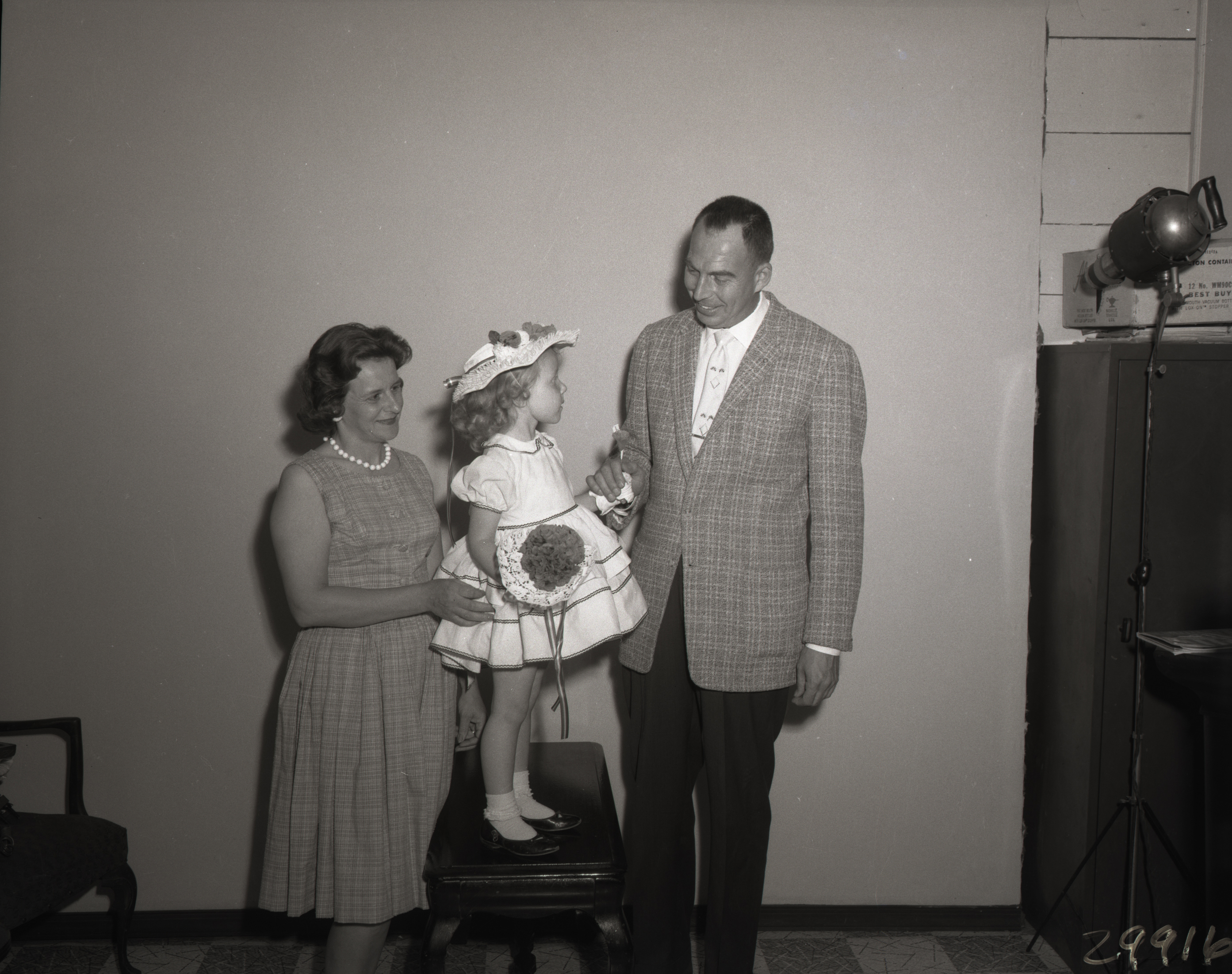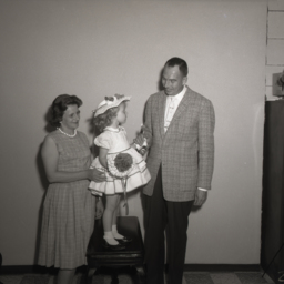 Unidentified man and woman, both wearing plaid, are posed on either side of an unidentified girl shown in profile standing on a bench and wearing a hat and gloves.