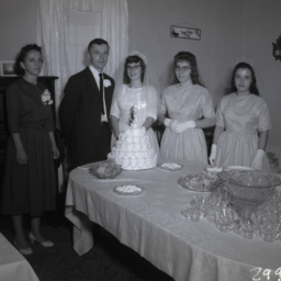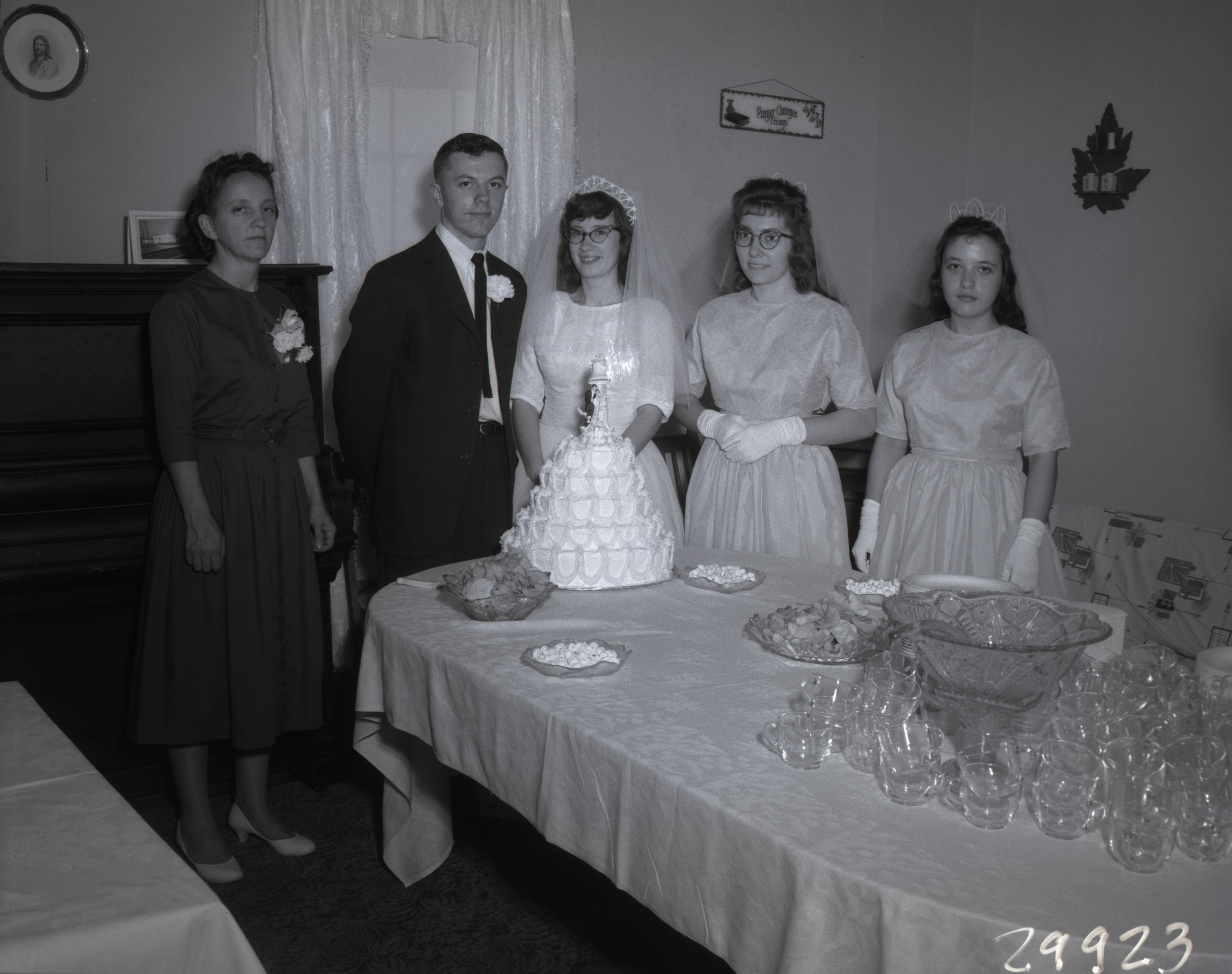 Unidentified bride and groom are standing with other unidentified people behind a table with a multi-tiered cake and punch bowl on it.