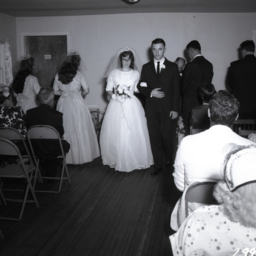 Unidentified bride and groom are walking arm-in-arm back down the aisle after exchanging their marriage vows.