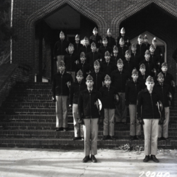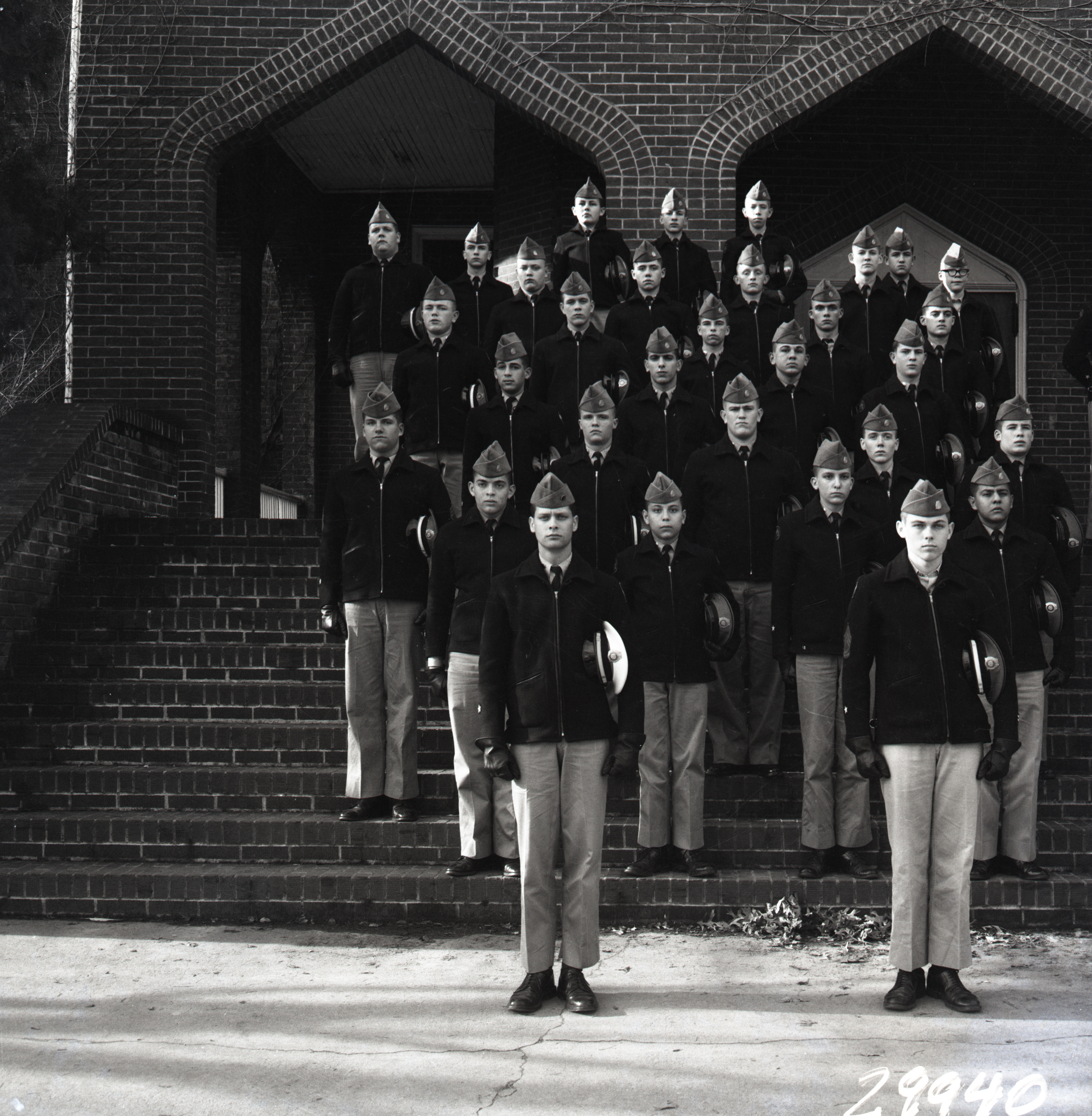 Group of unidentified cadets from Massanutten Military Academy (MMA) posed on the steps of Lantz Hall in their school's uniform.