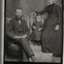 Photo of an older photograph of an unidentified bearded man, seated, with an unidentified woman and young child standing beside him.