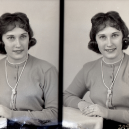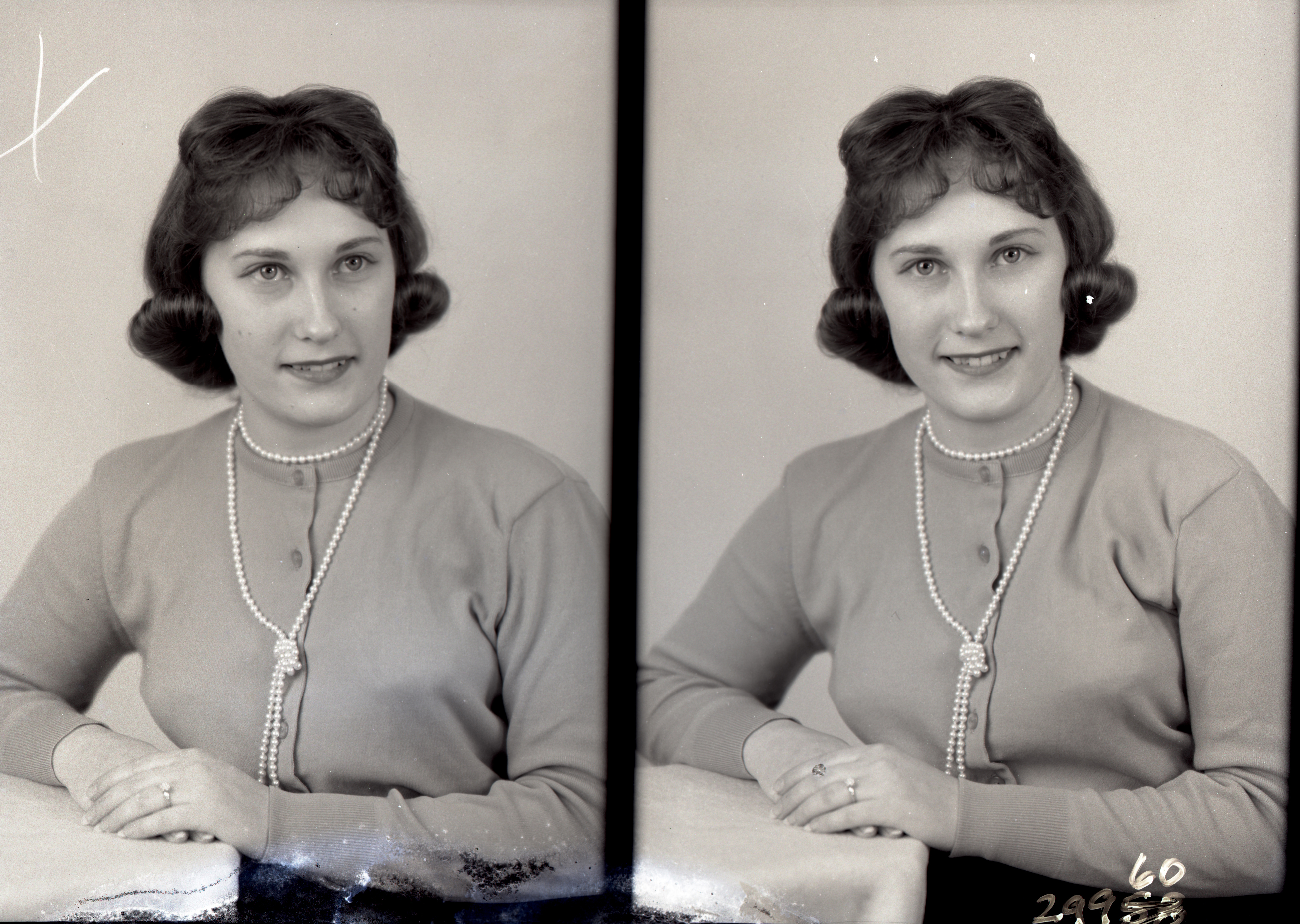 Photo of two separate portrait photographs of the same unidentified woman with short, styled hair and wearing a long necklace of faux pearls.