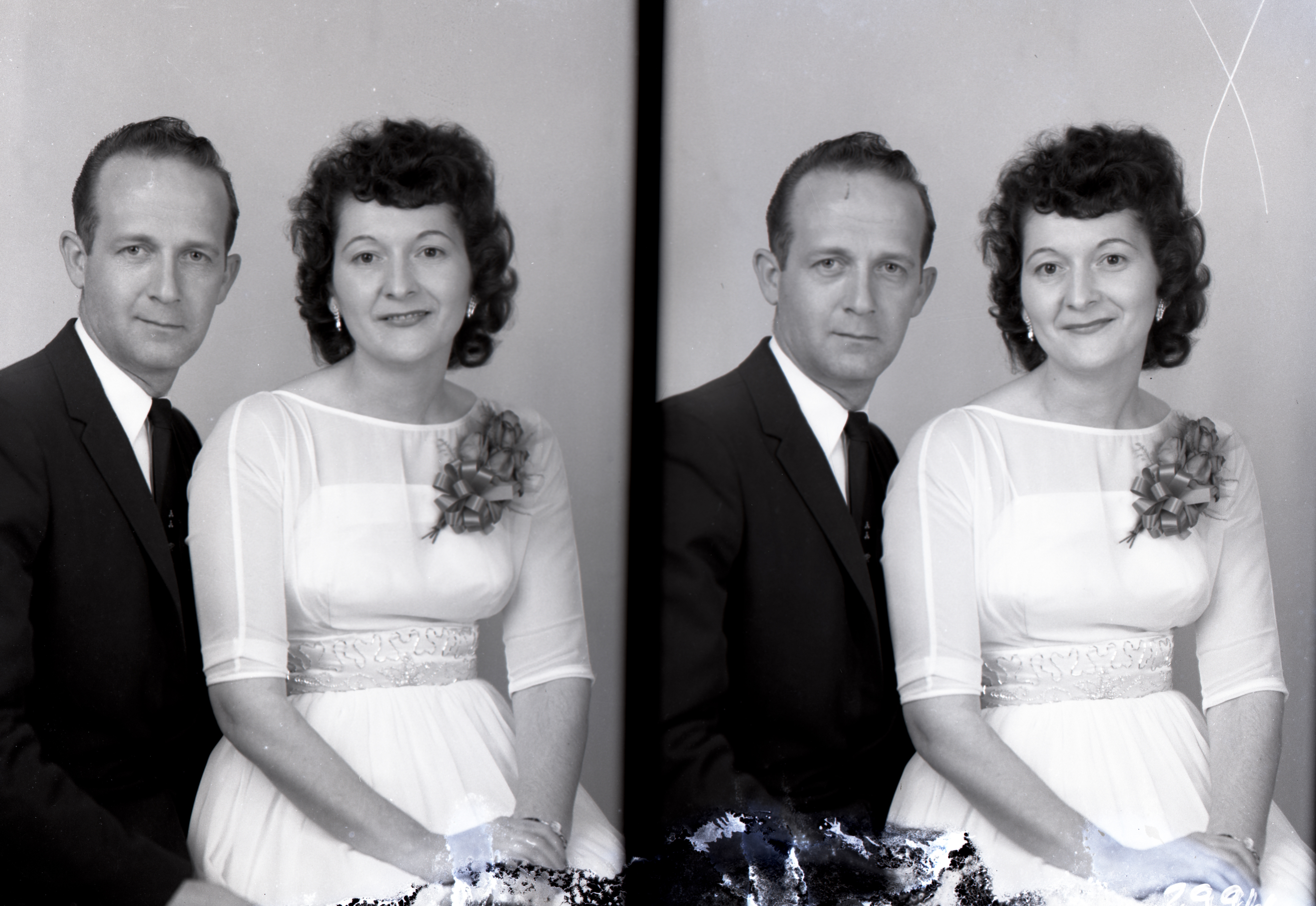 The man is wearing a suit and tie. The woman has a corsage on the front of her dress.