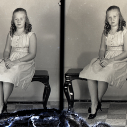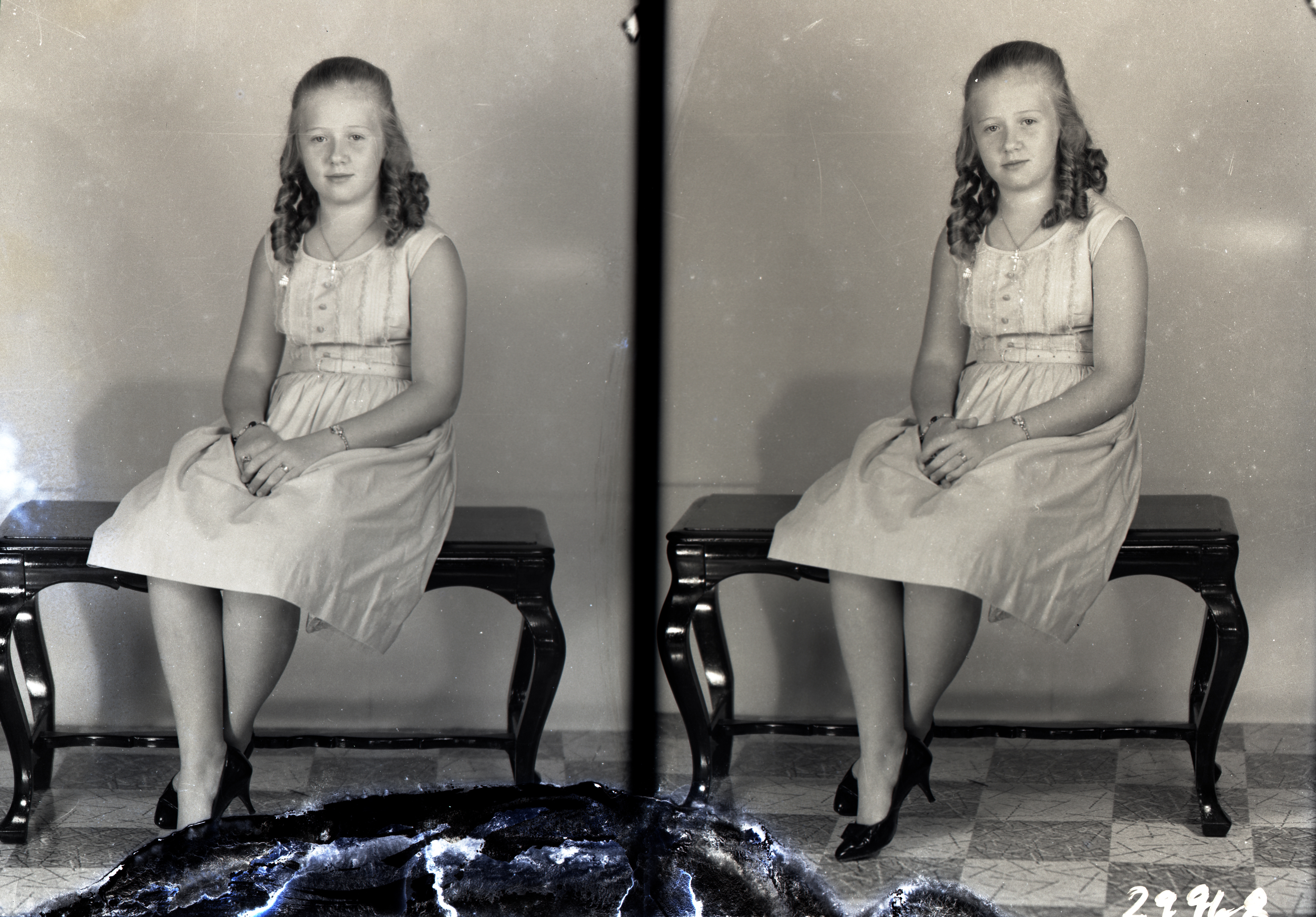 Photo of two separate photographs of the same unidentified girl seated on a bench with her hands in her lap and her ankles crossed.