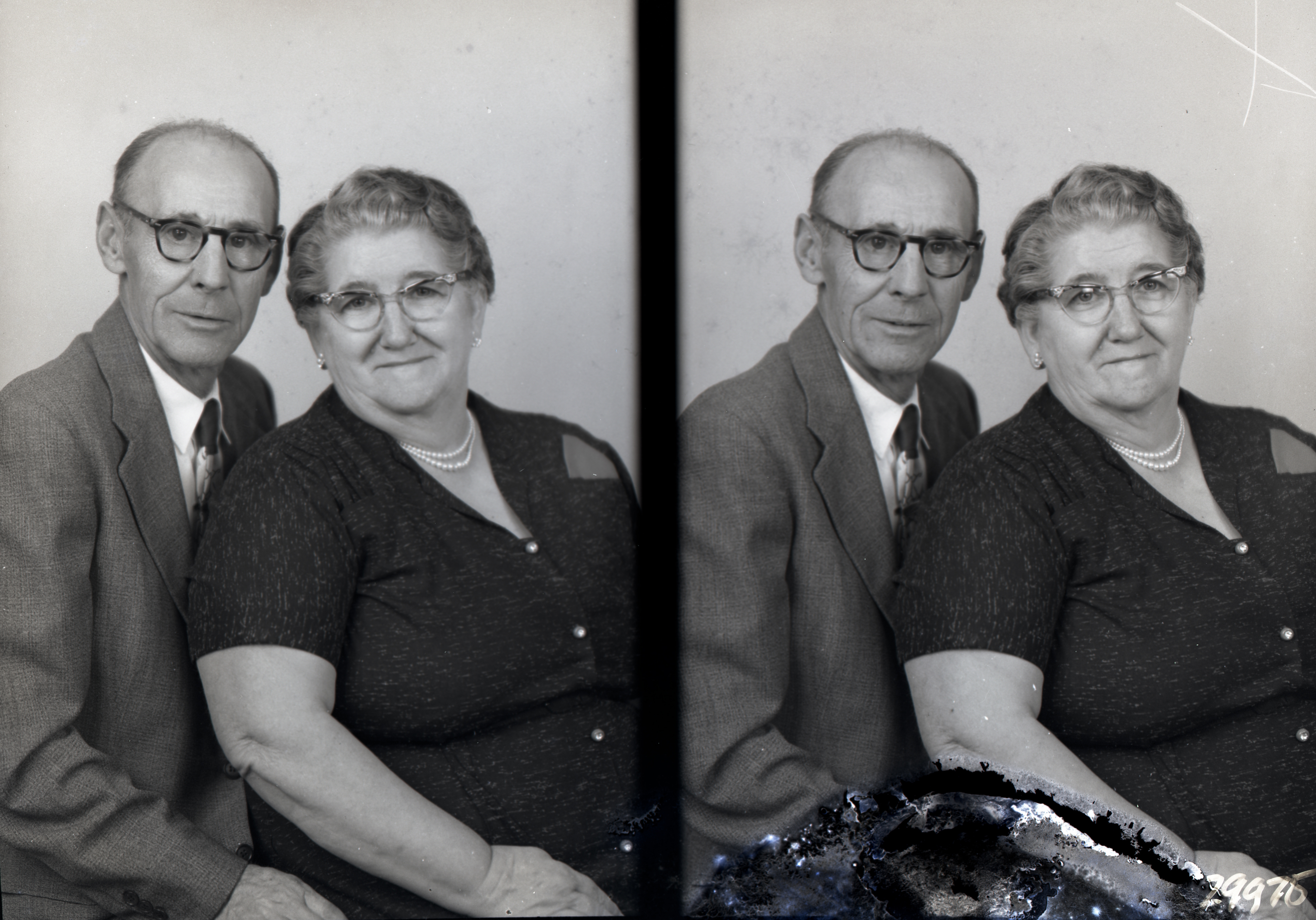 Photo of two separate portrait photographs of the same unidentified older man and woman posed together.