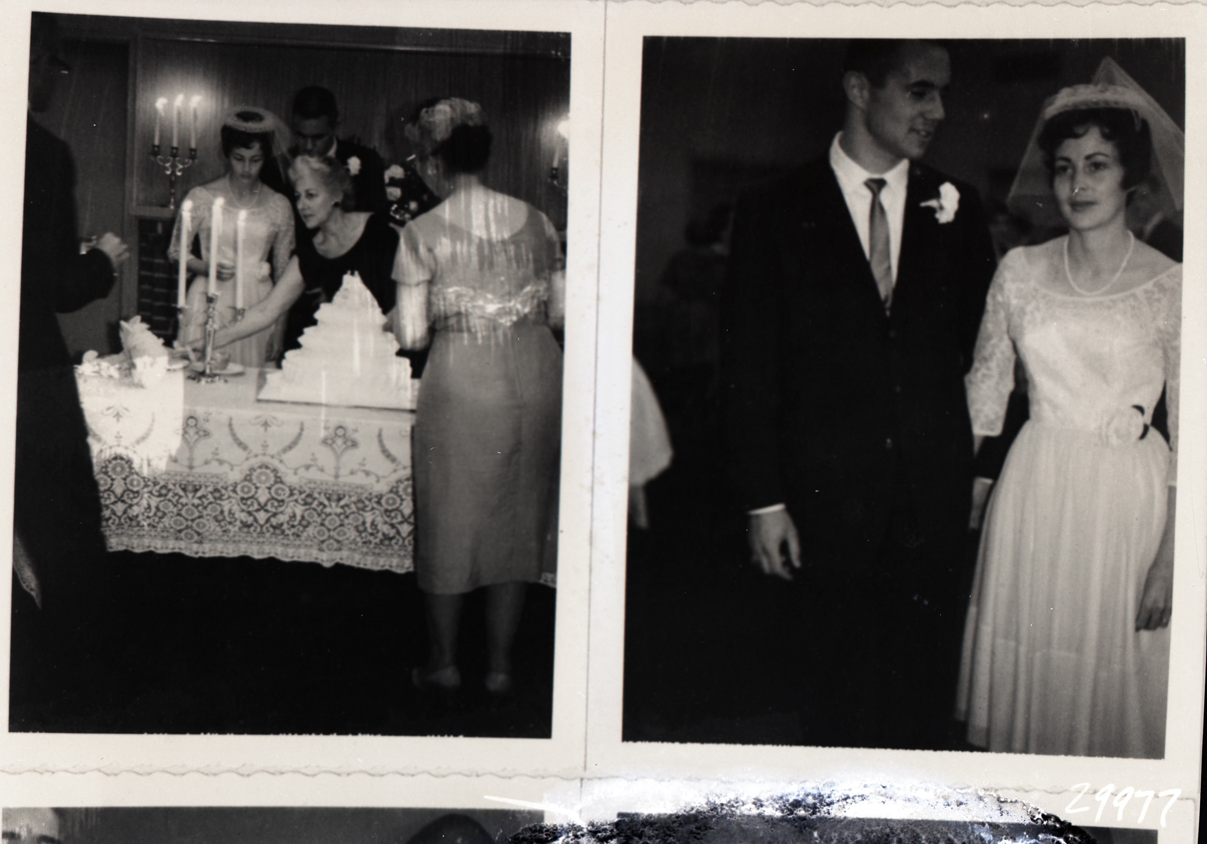 On the left, the unidentified bride and others are standing behind the multi-tiered wedding cake.