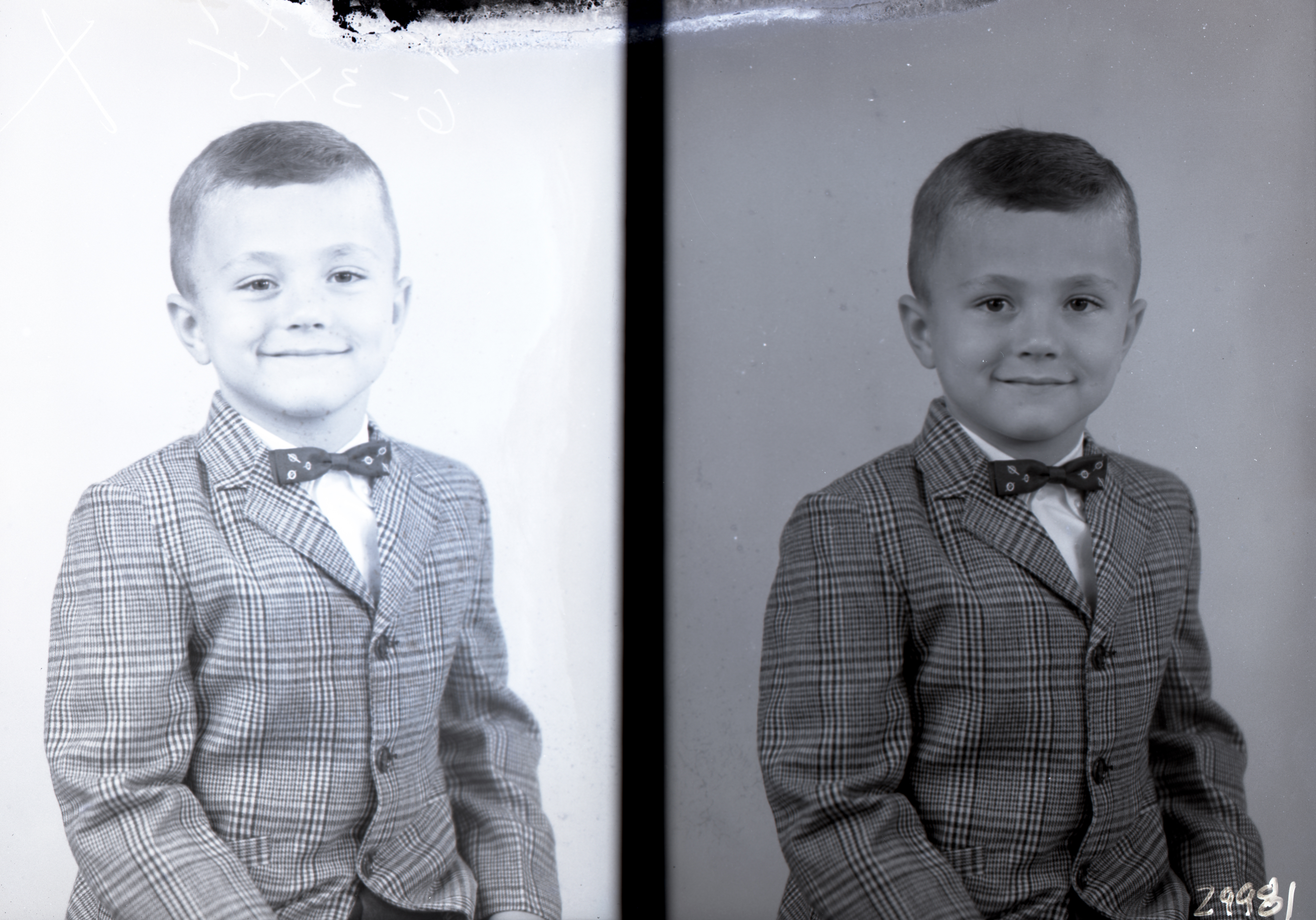 Photo of two separate portrait photographs of Philip D. Hottel as a young boy wearing a plaid suit jacket and bow tie.