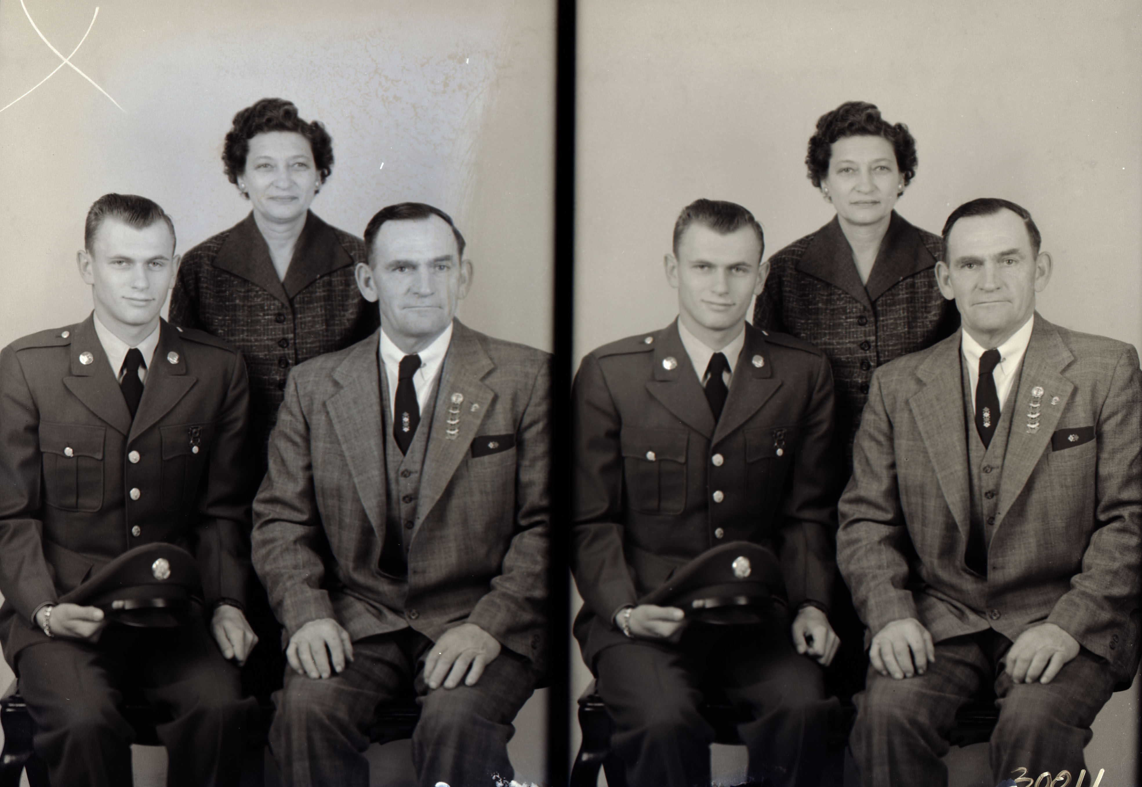 Photo of two separate photographs of Martin Ritenour (left)in his U.S. Army uniform and seated beside his father, Chester F. Ritenour. His mother, Mabel (Shiley) Ritenour, is standing behind the two men.