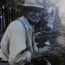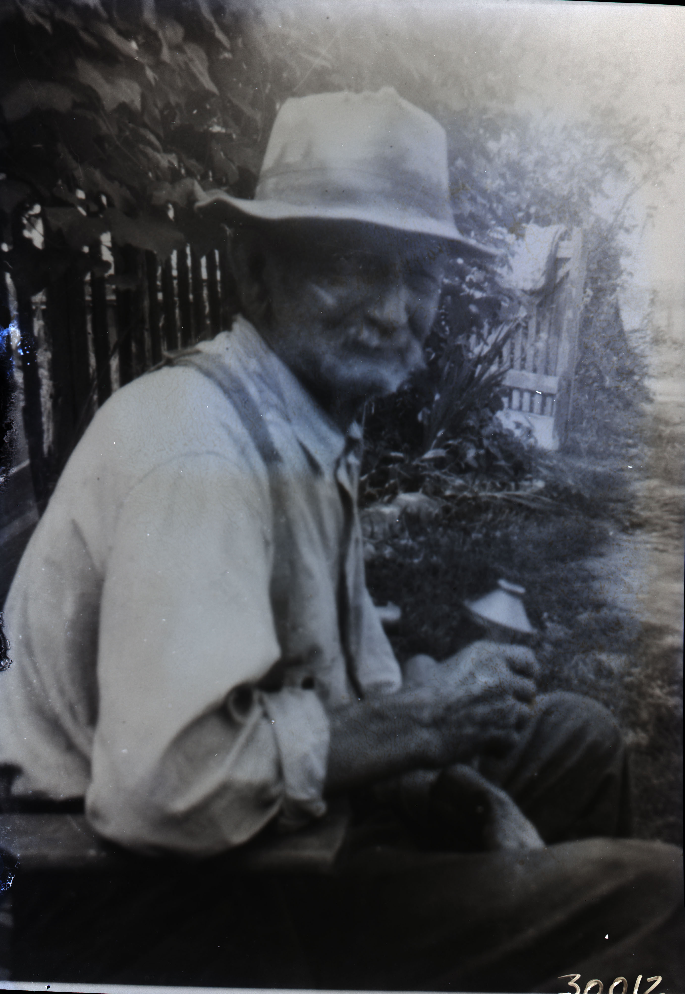Unidentified man with a mustache and wearing work clothes with a hat, is seated outdoors. Behind him is a wood fence that stretches into the distance.