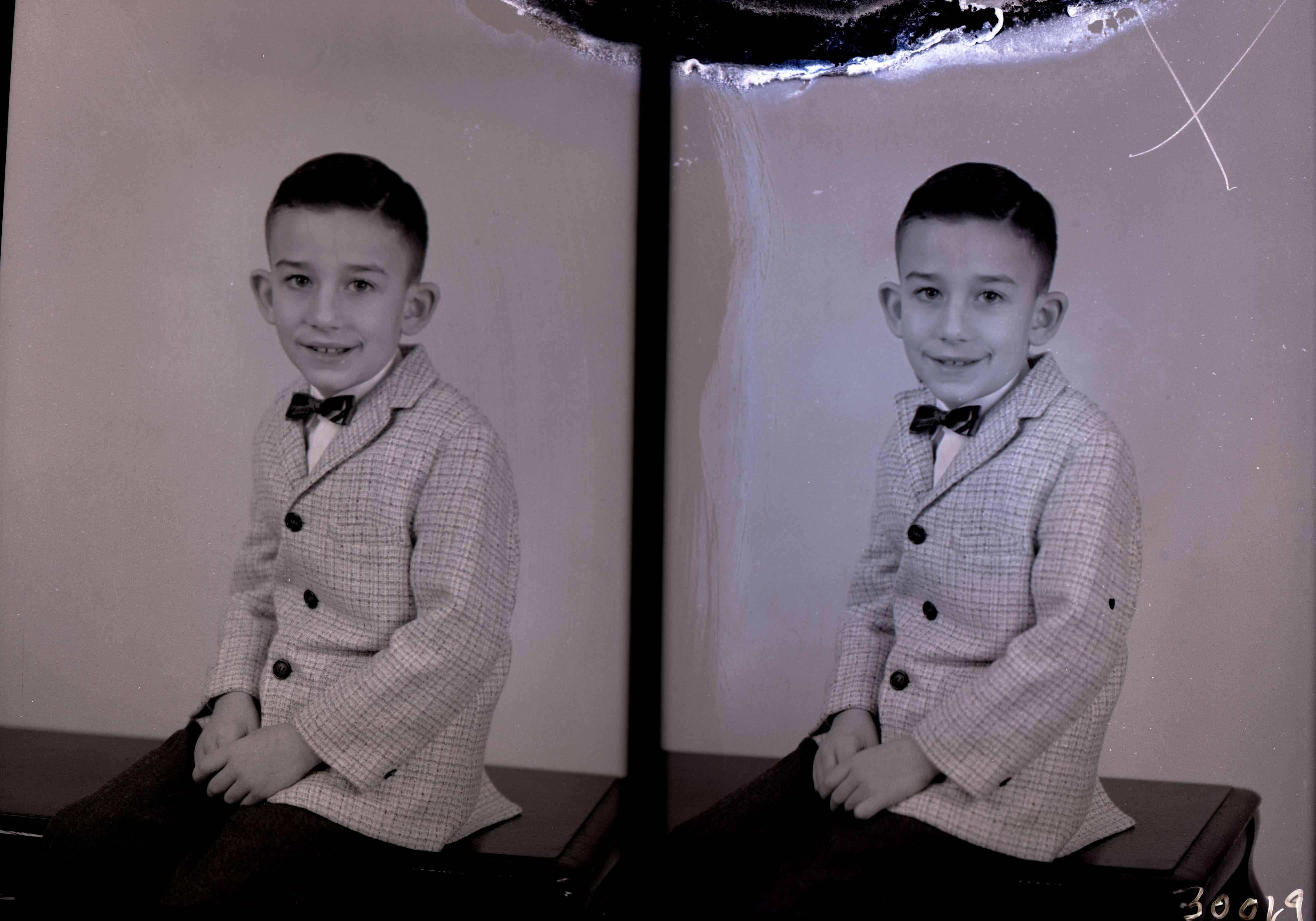Photo of two separate photographs of the same unidentified young boy wearing a suit and bow tie.