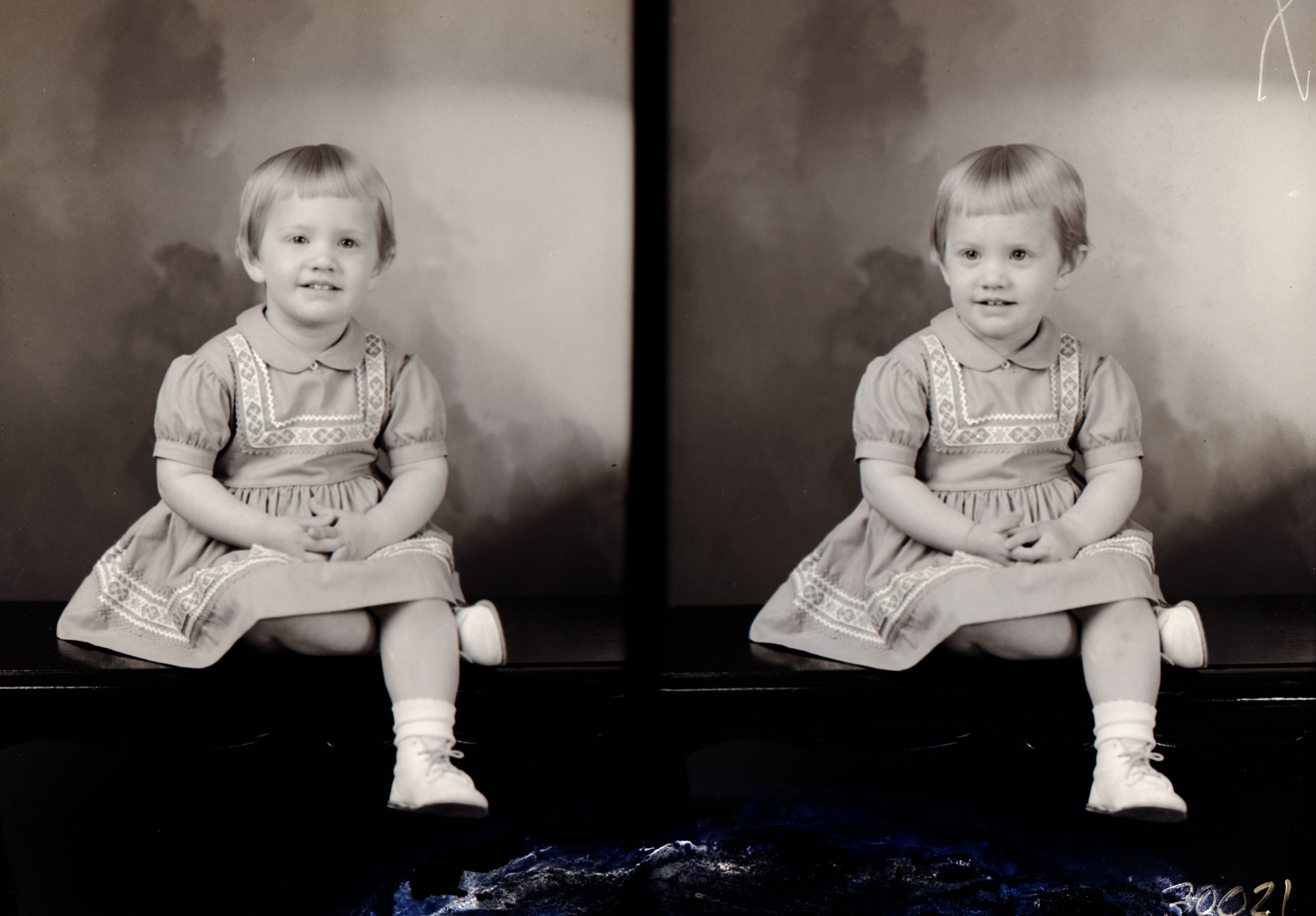 Photo of two separate photographs of the same unidentified young girl with short hair and bangs. She is seated with one leg under the other.