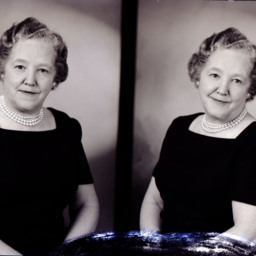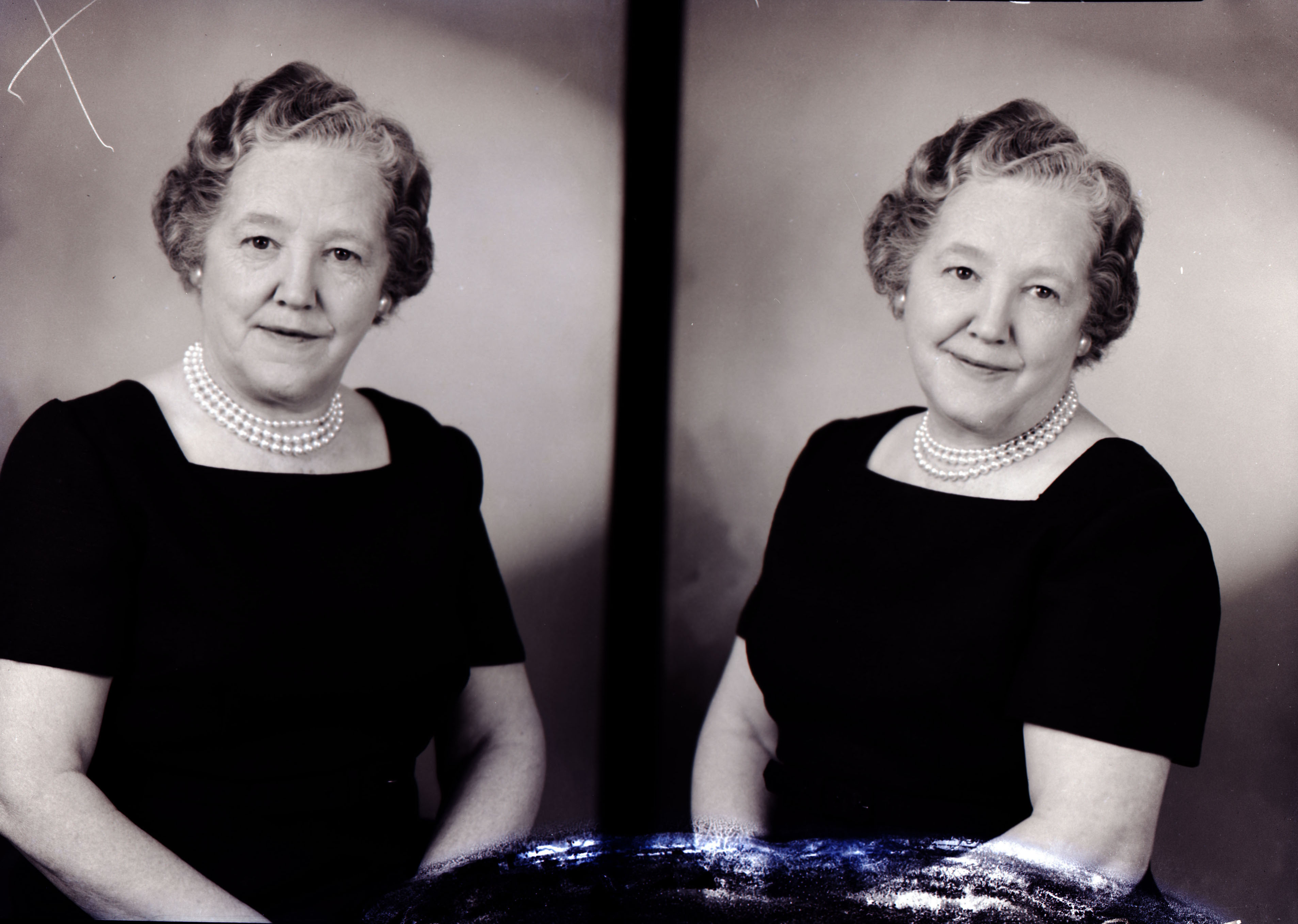 Photo of two separate portrait photographs of the same unidentified older woman with short hair and wearing a faux pearl necklace.