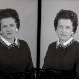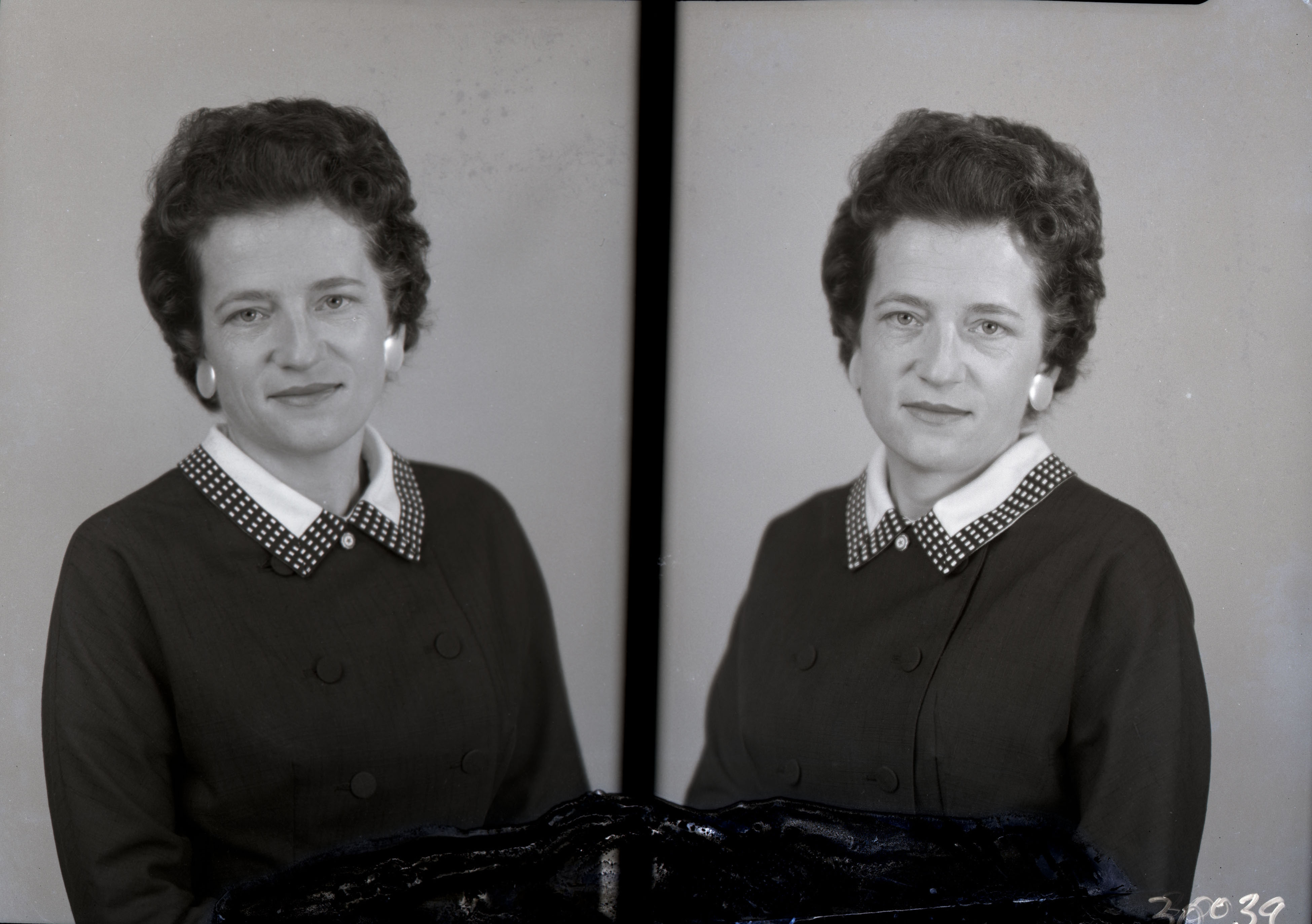 Photo of two separate portrait photographs of the same older unidentified woman with short, styled hair and wearing earrings.