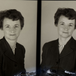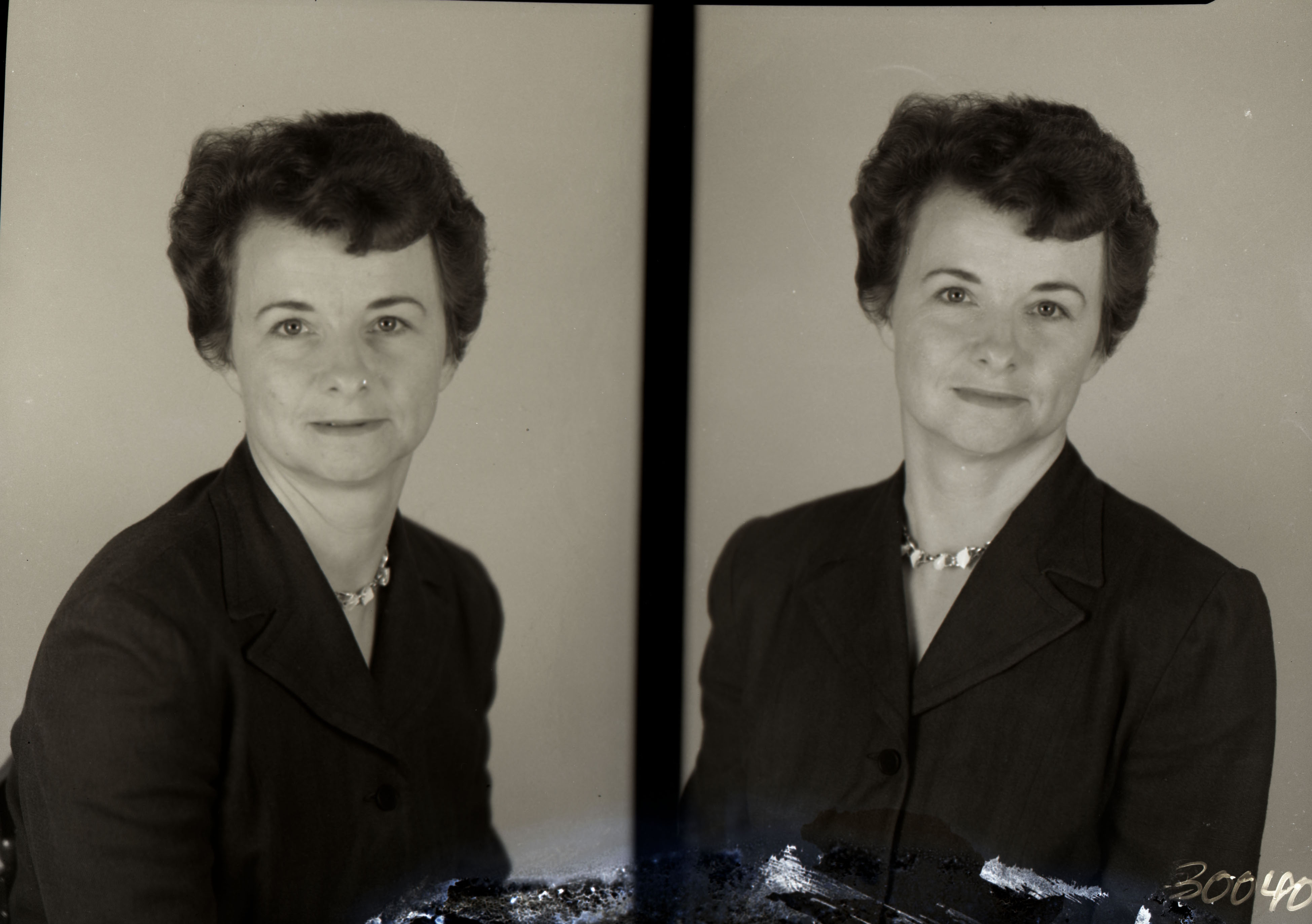 Photo of two separate portrait photographs of the same unidentified woman with short hair and wearing a necklace.
